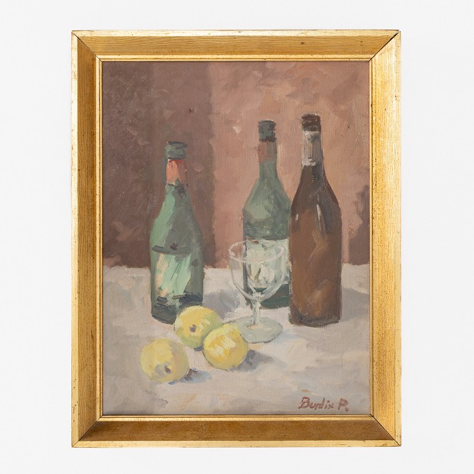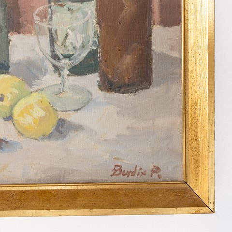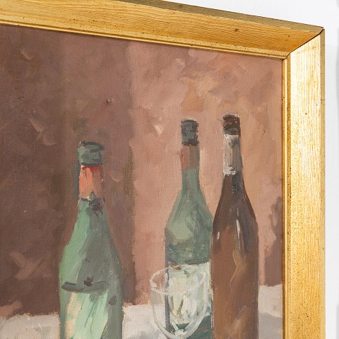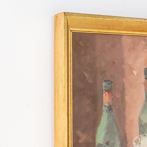 'Olie på lærred. Opstilling med vin og citroner med guldbemalet ramme. Signeret.