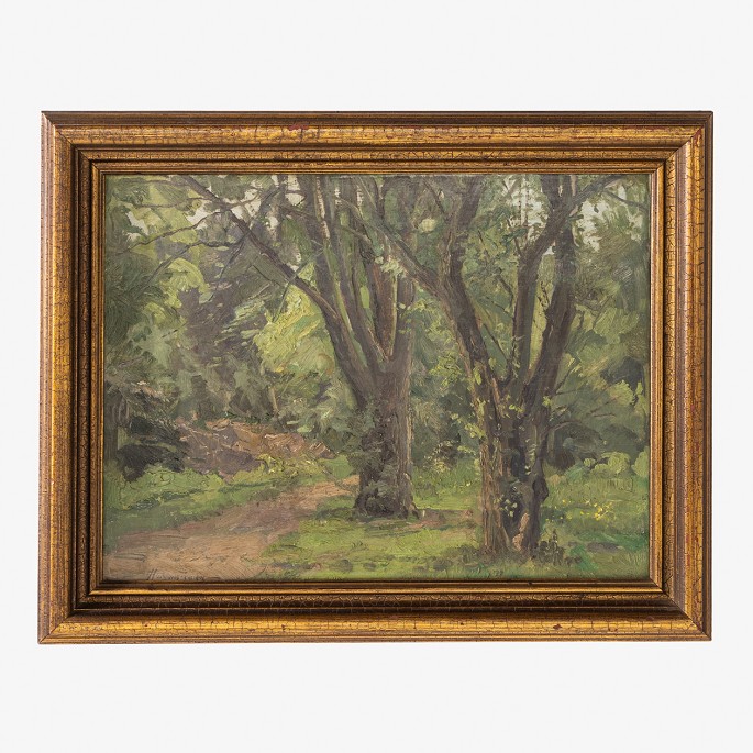 Olie på lærred. Forstbotanisk have i juni, med guldbemalet ramme. Signeret.