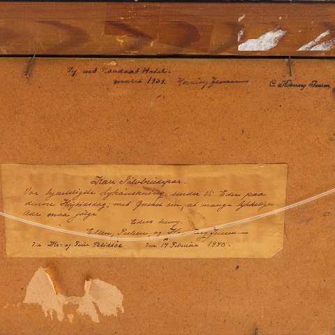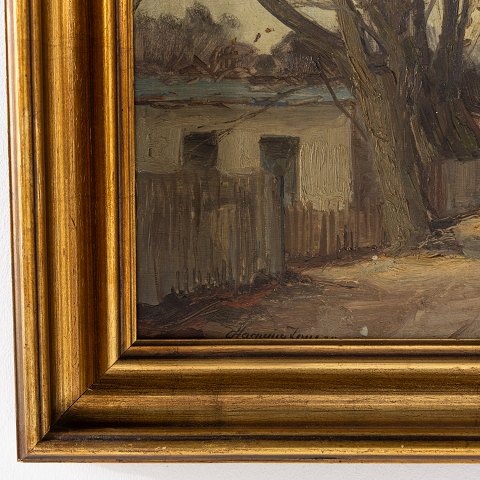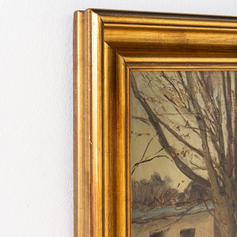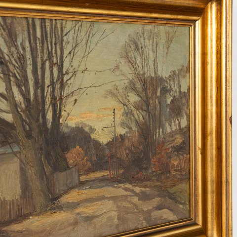 Olie på lærred. Vej ved Raavad Hotel fra 1939, med guldbemalet ramme. Signeret. Note på bagsiden.