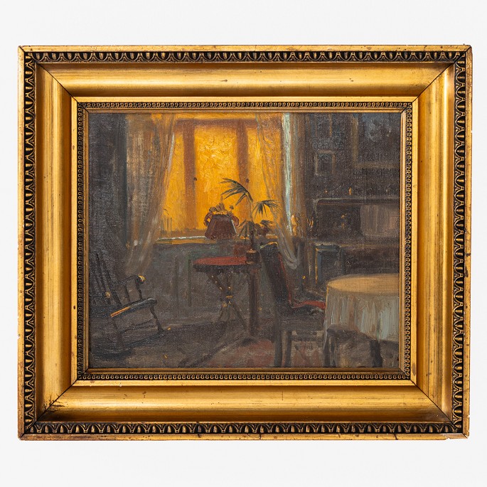 Maleri af indretning, olie på lærred, bemalet guldramme. Signeret på bagside.