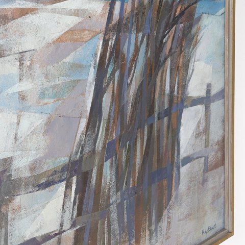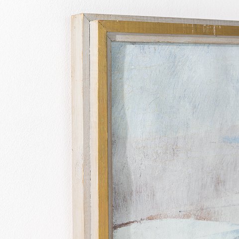 Signeret maleri med titlen 'Vinterland' fra 1998. Grå ramme i træ. Olie på lærred.