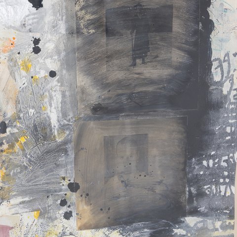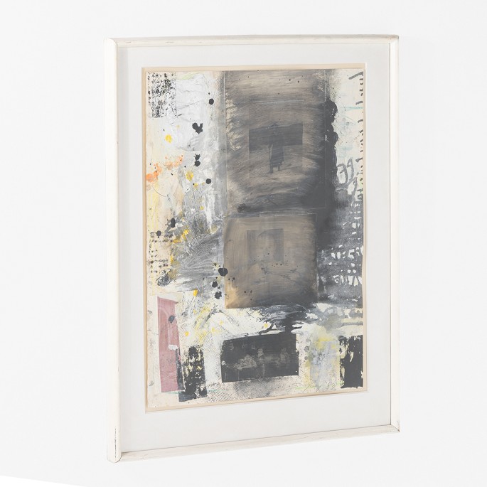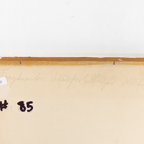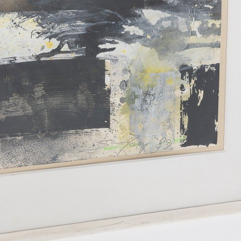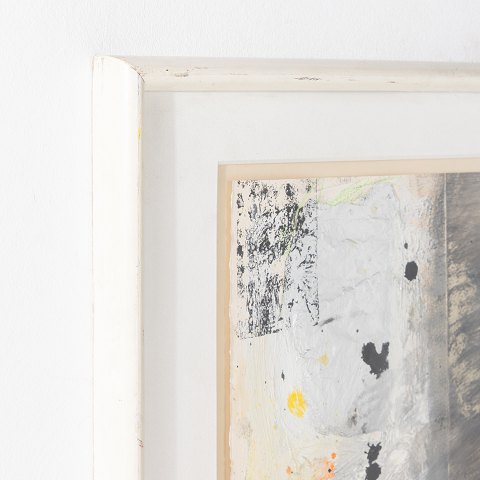 Collage/tegning/Mixed Media fra 1989. Signeret. Tekst på bagside. Hvid ramme.