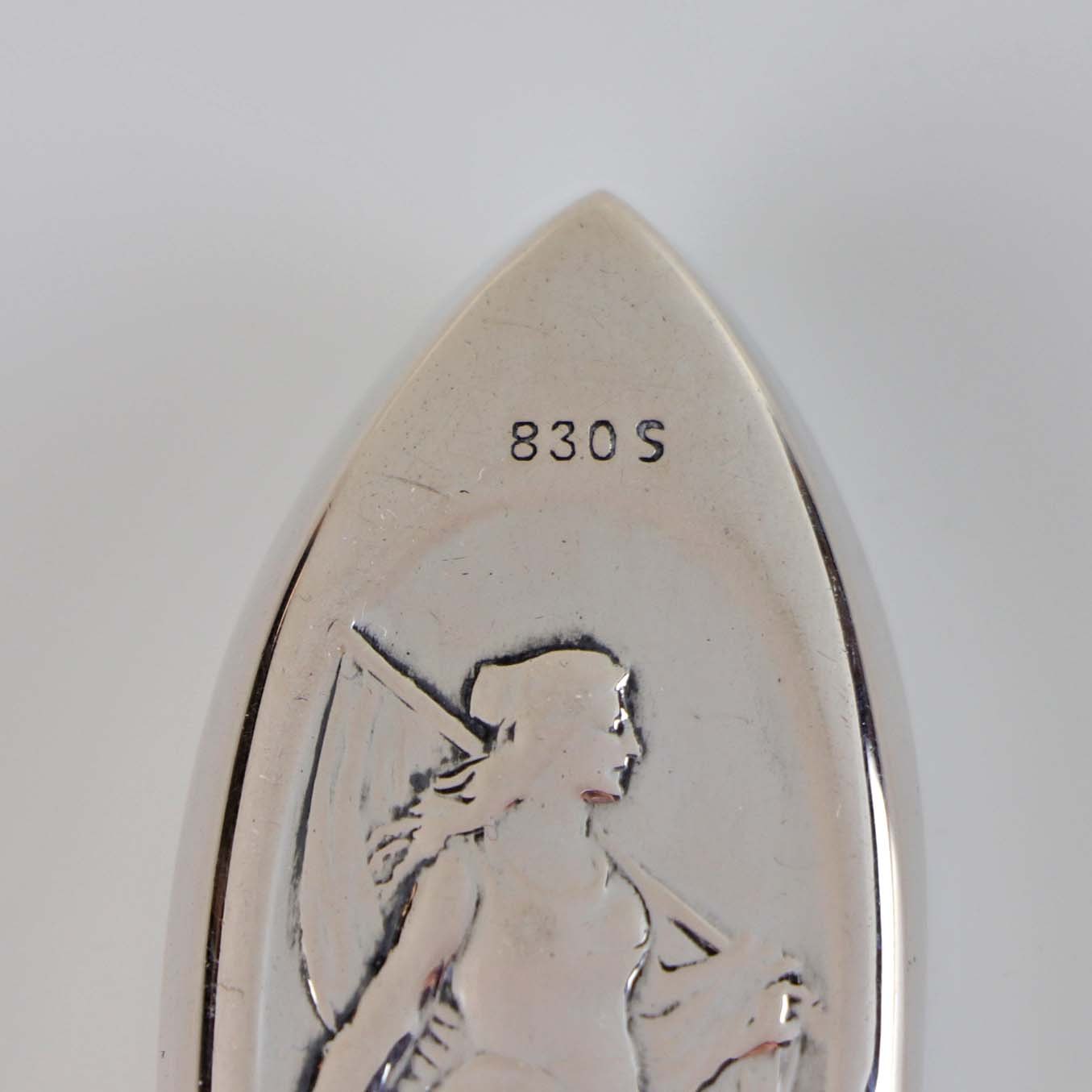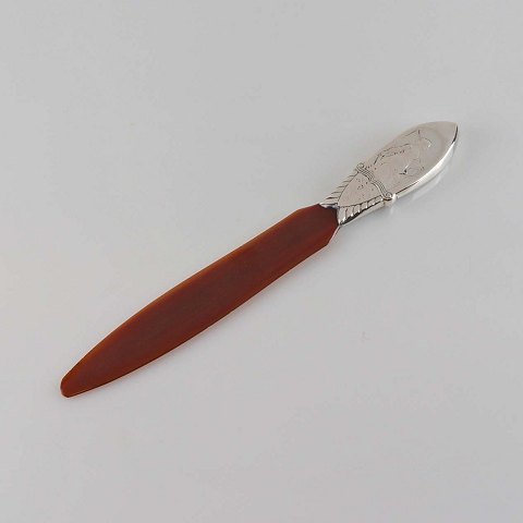 Brevkniv af ben. Top af sølv med motiv af kvinde med sværd og flag samt tre løver