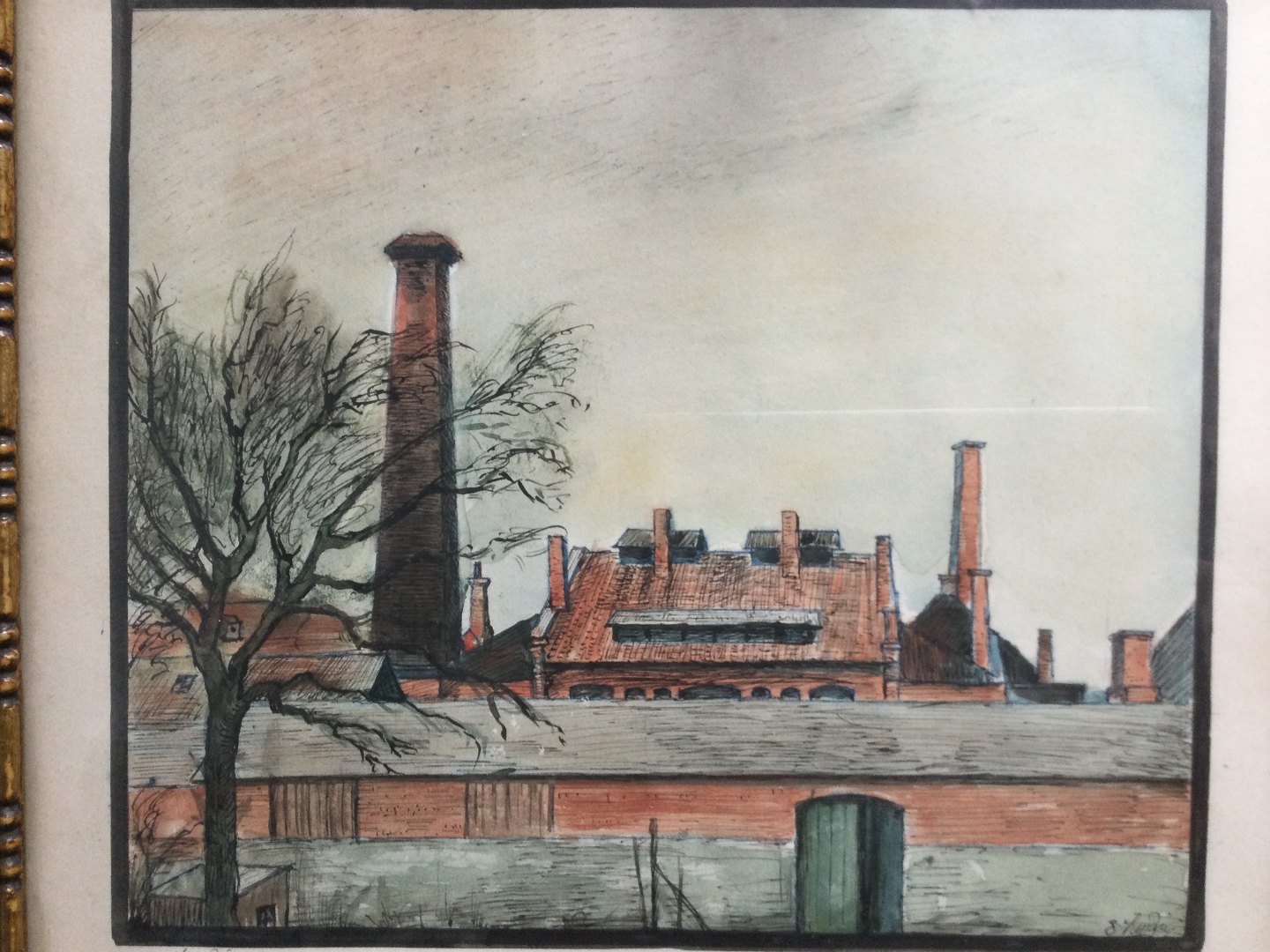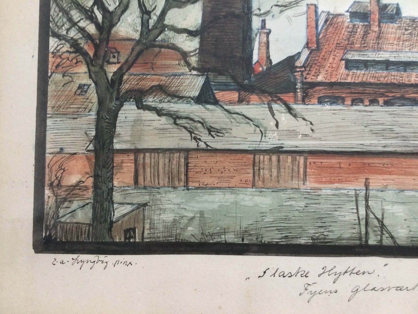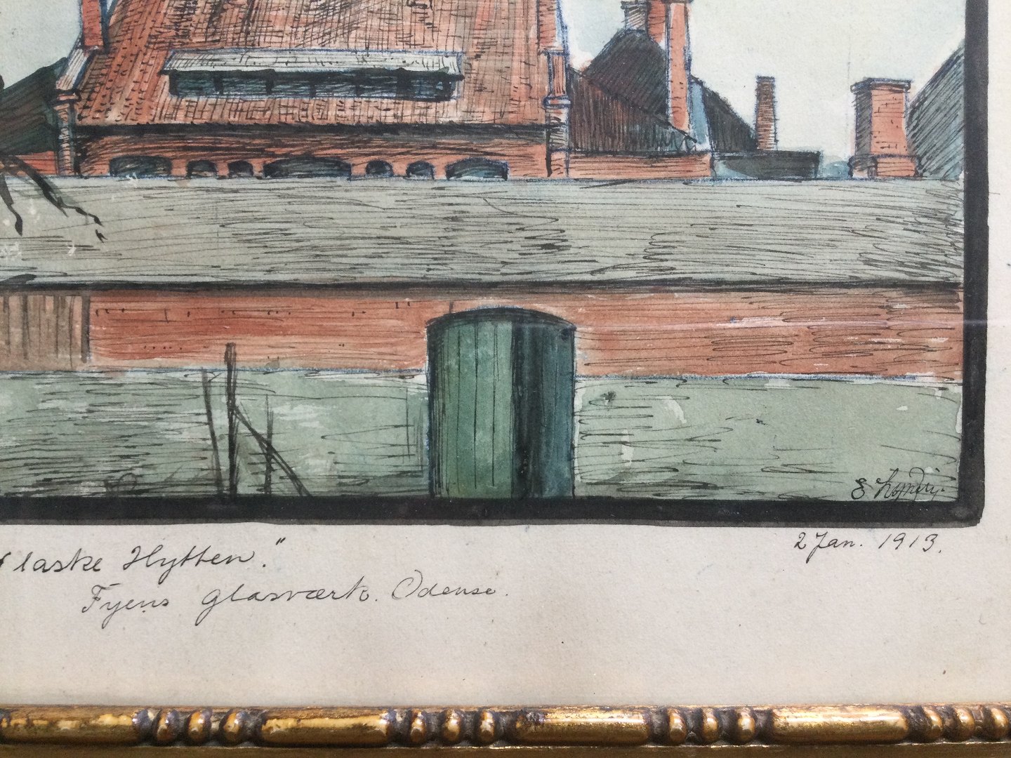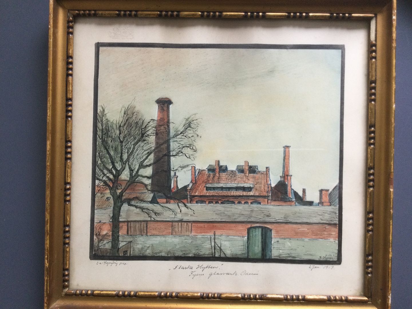Tegning af E. Lyngvig - Flaskehytten ved Fyens Glasværk Odense 1913.