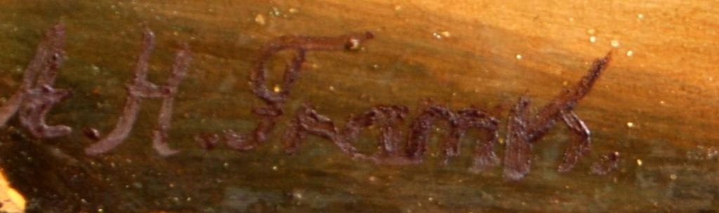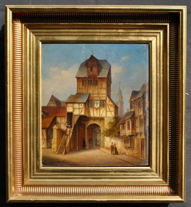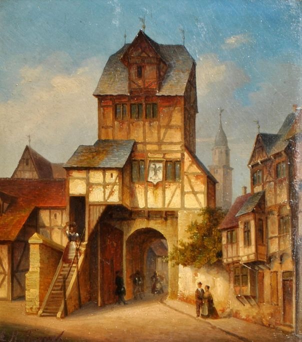 Frank, A. H (19. årh.): Hotel og tårn i en tysk by. Olie på malerpap. Signeret. Verso signeret 1868. 26 x 23 cm.