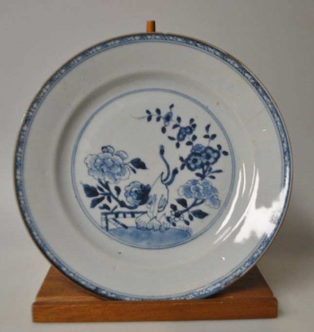 Kinesisk blåmalet tallerken, ca. 1780. Dekoreret med blomster og traner. Dia.: 22,7 cm.