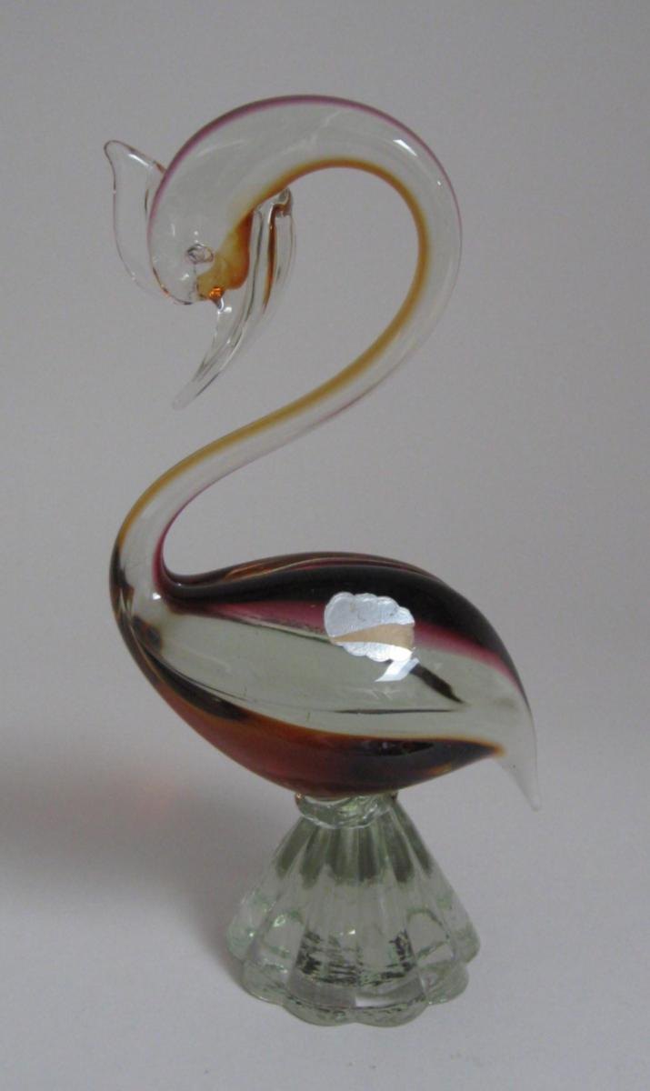 Veneziansk fugl i glas, ca.1960. I violet/gult glas med overfangsglas i klart glas. Fod i kegleformet klart glas. H.: 27 cm. Med original label.: Made in venezia, Italy. Flot stand.