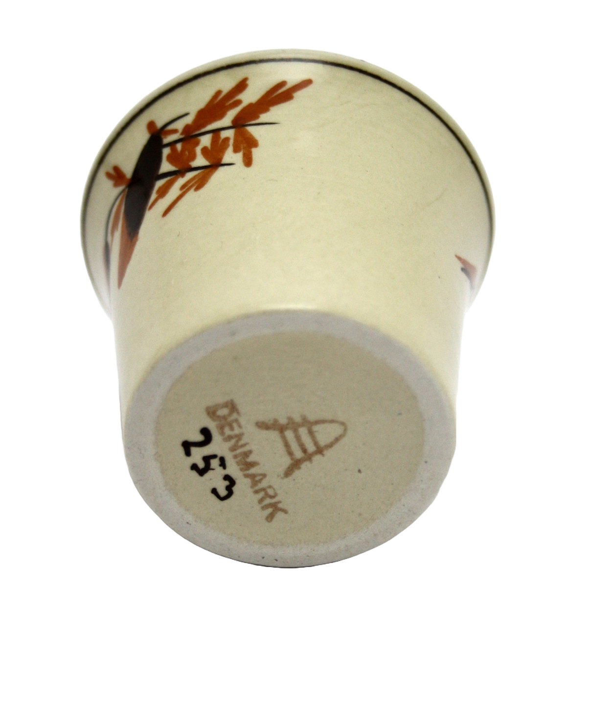 Aluminia, Aakjær dek.nr. 253, håndmalet. Designet af Thorkild Olsen. Produceret i perioden 1934-39. Æggebæger. Diameter 5 cm. Højde 4,5 cm. Pris: 75 kr. stk. Lager: 1
