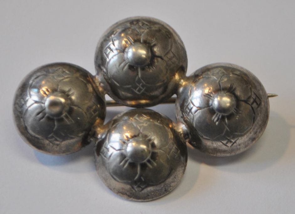 Antik brosche af 4 sølv knapper, Fabek Christian Fischer (1820 - 1914), NIbe, Danmark.