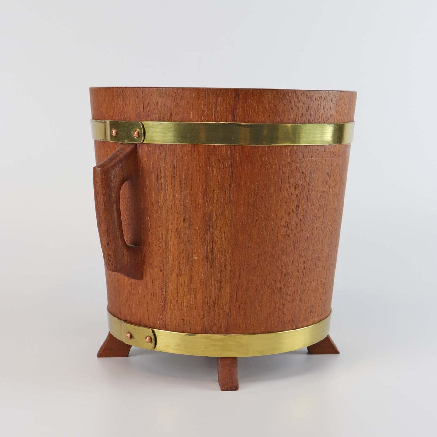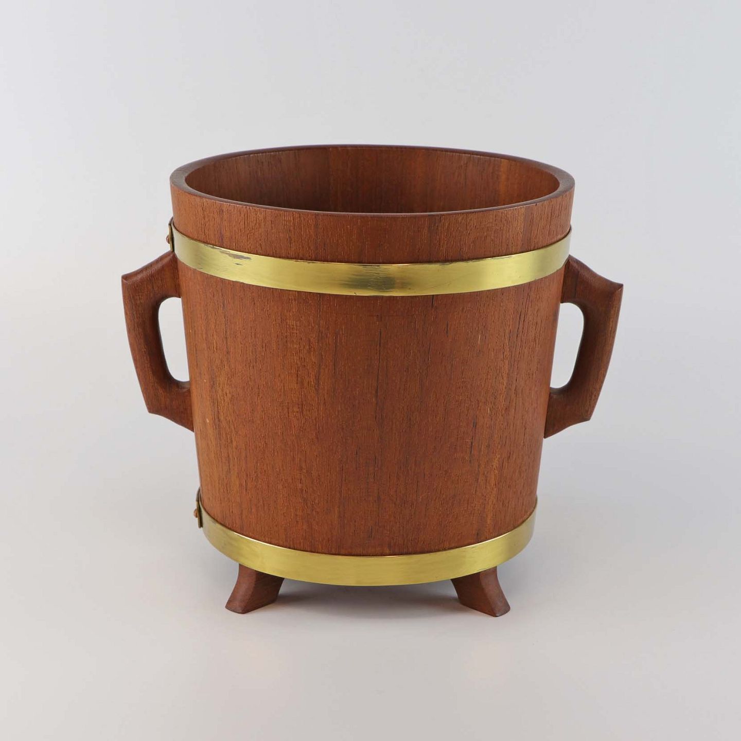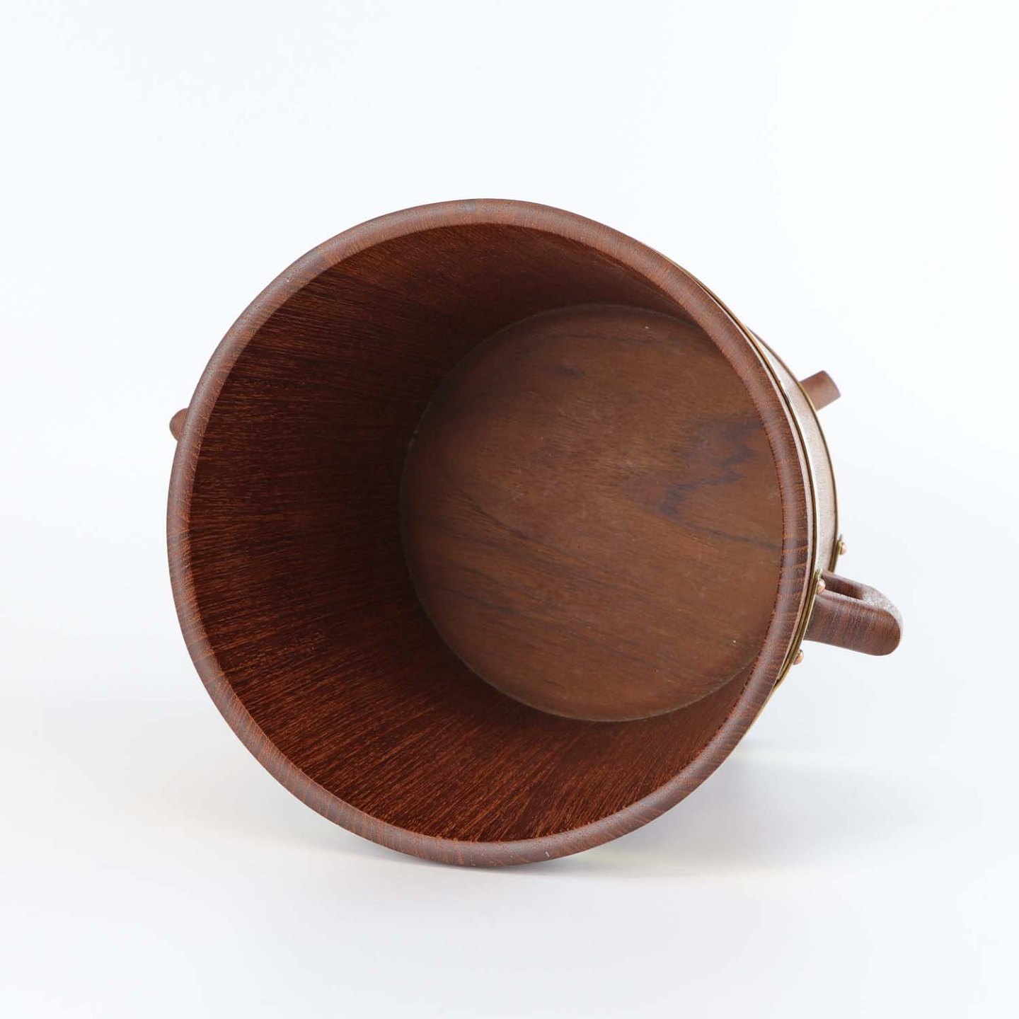 Spand i teaktræ med hanke. Remme af messing og søm i kobber.