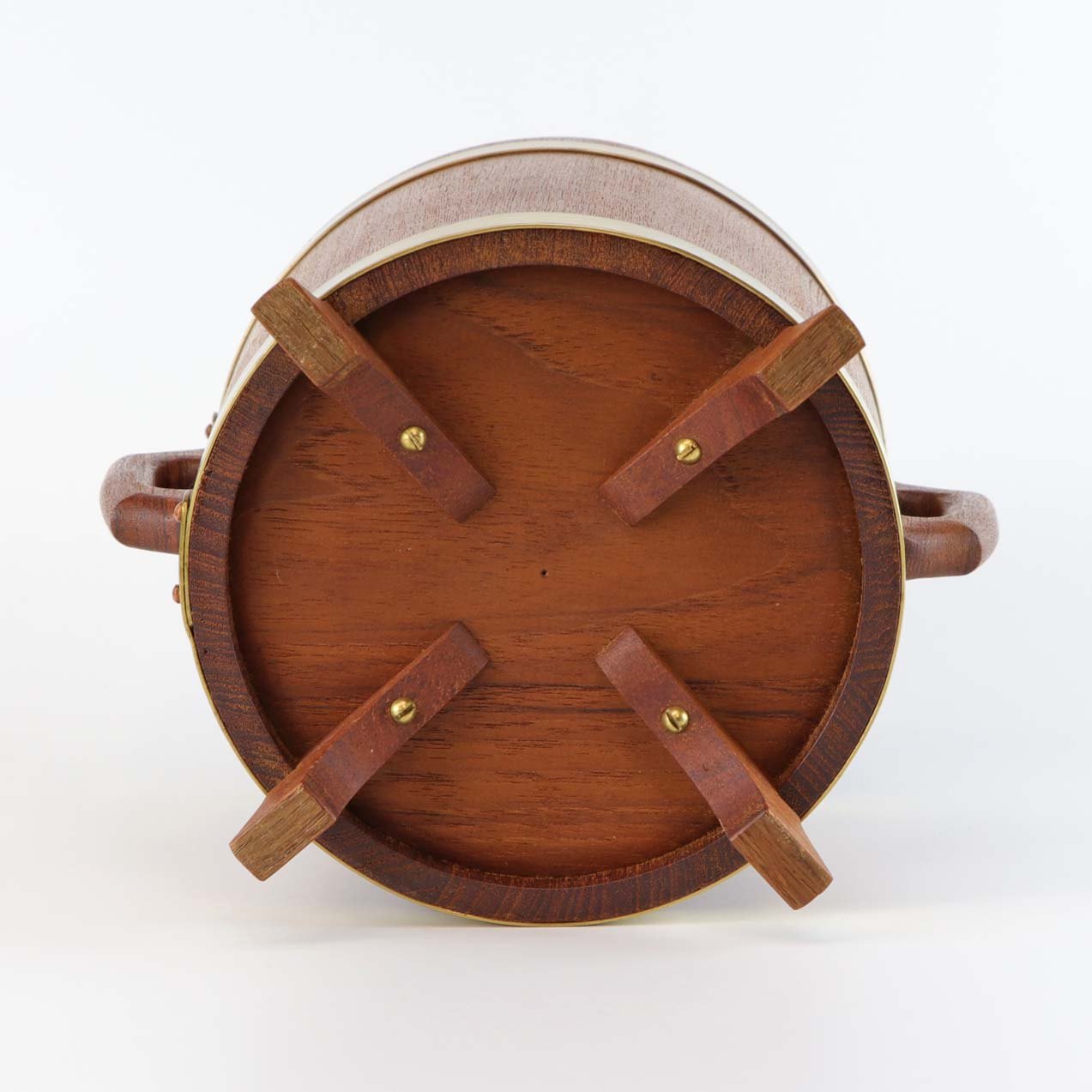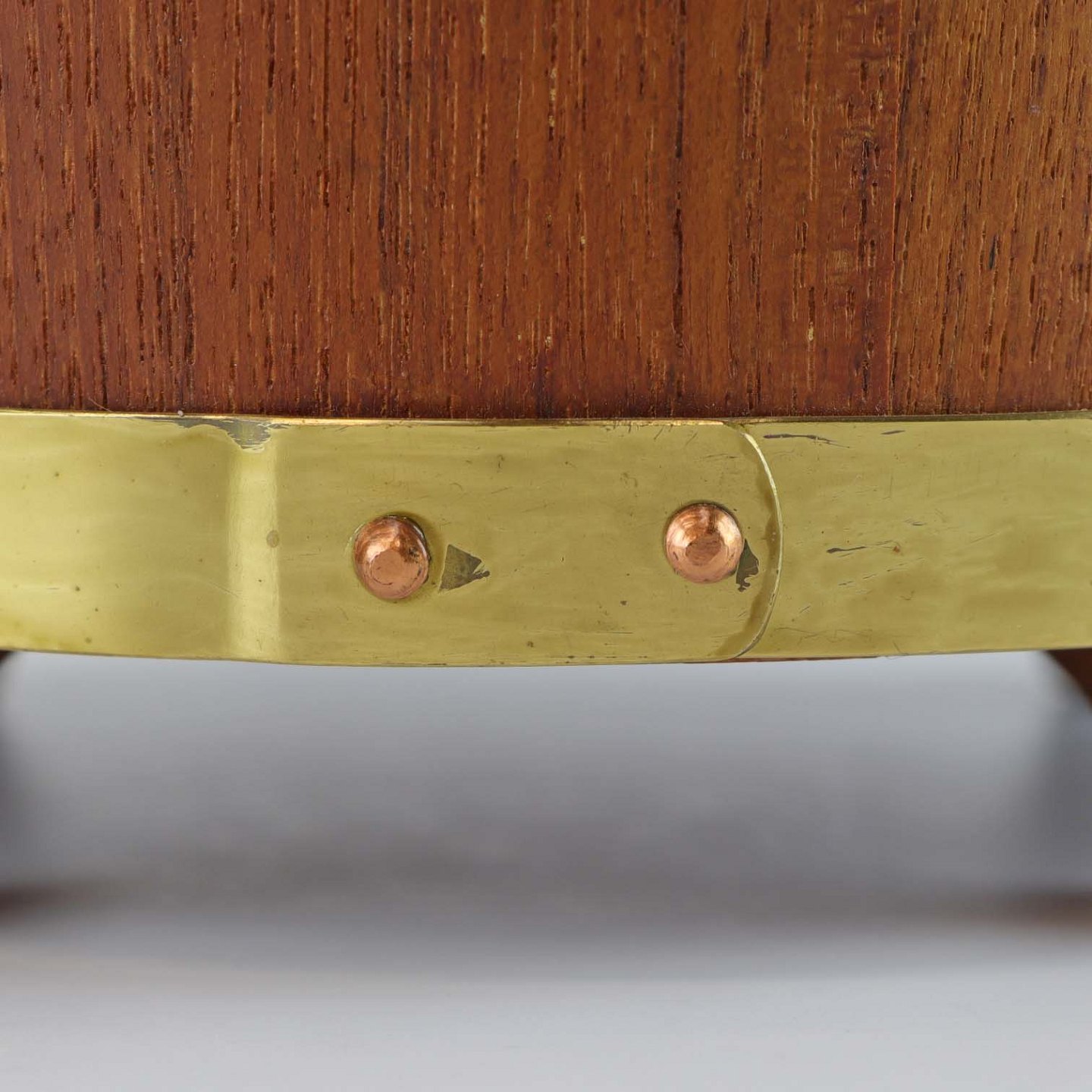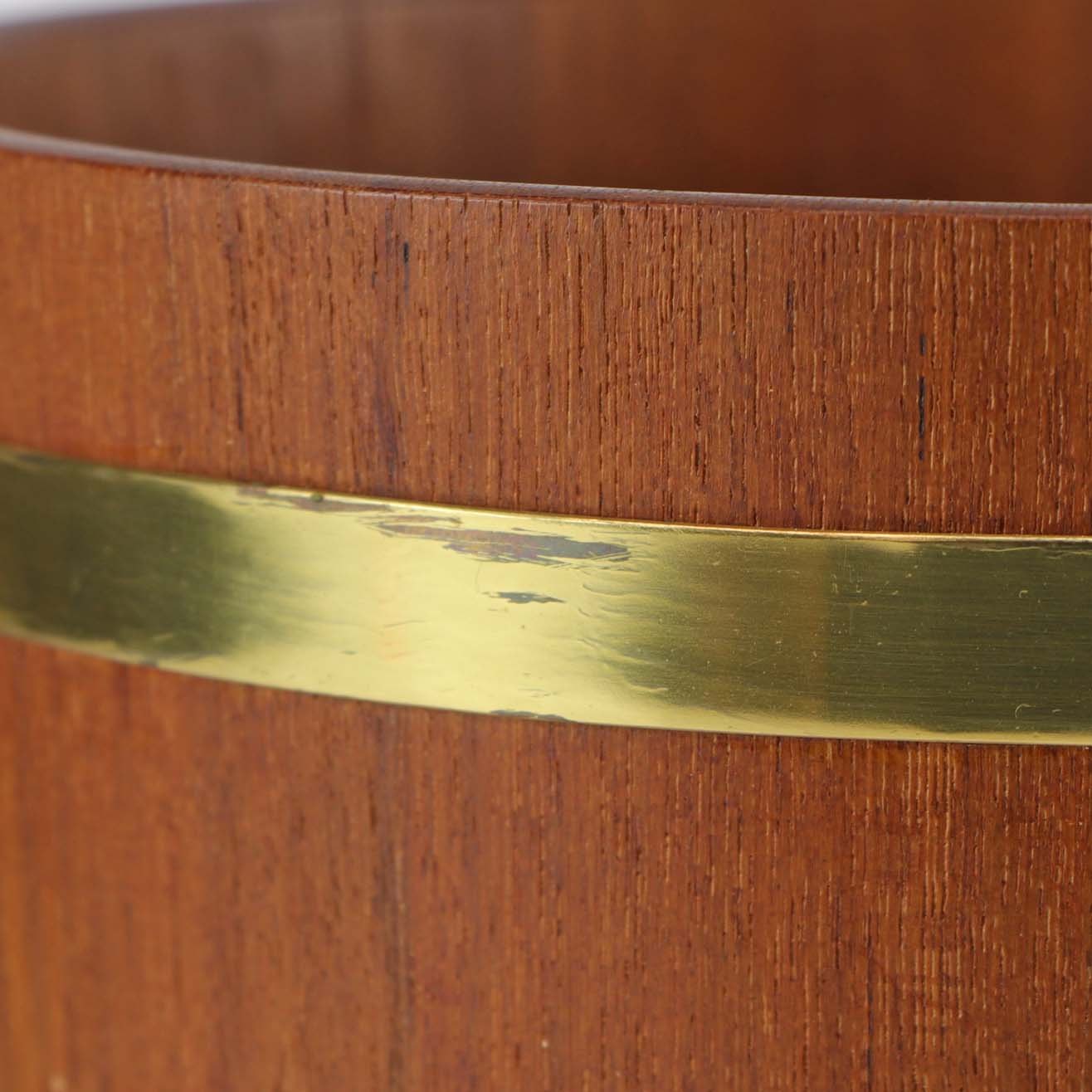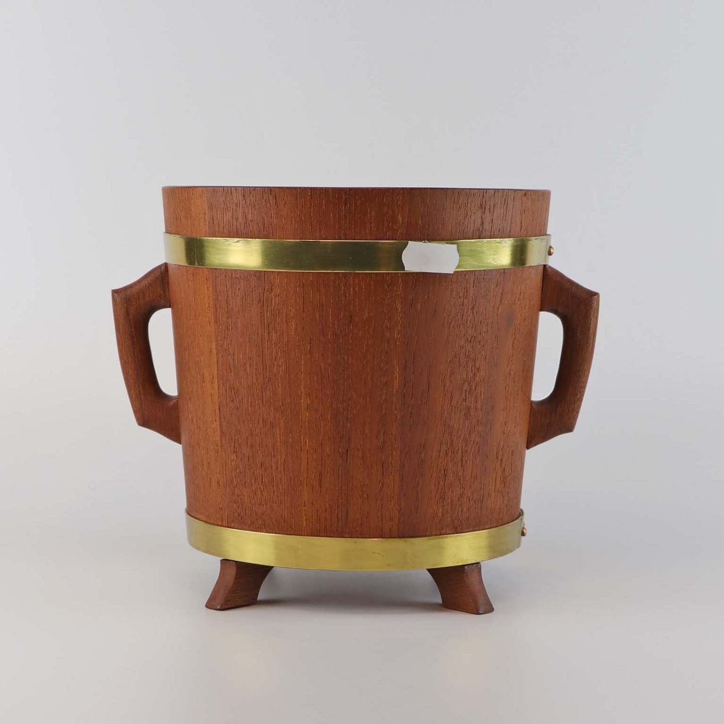 Spand i teaktræ med hanke. Remme af messing og søm i kobber.