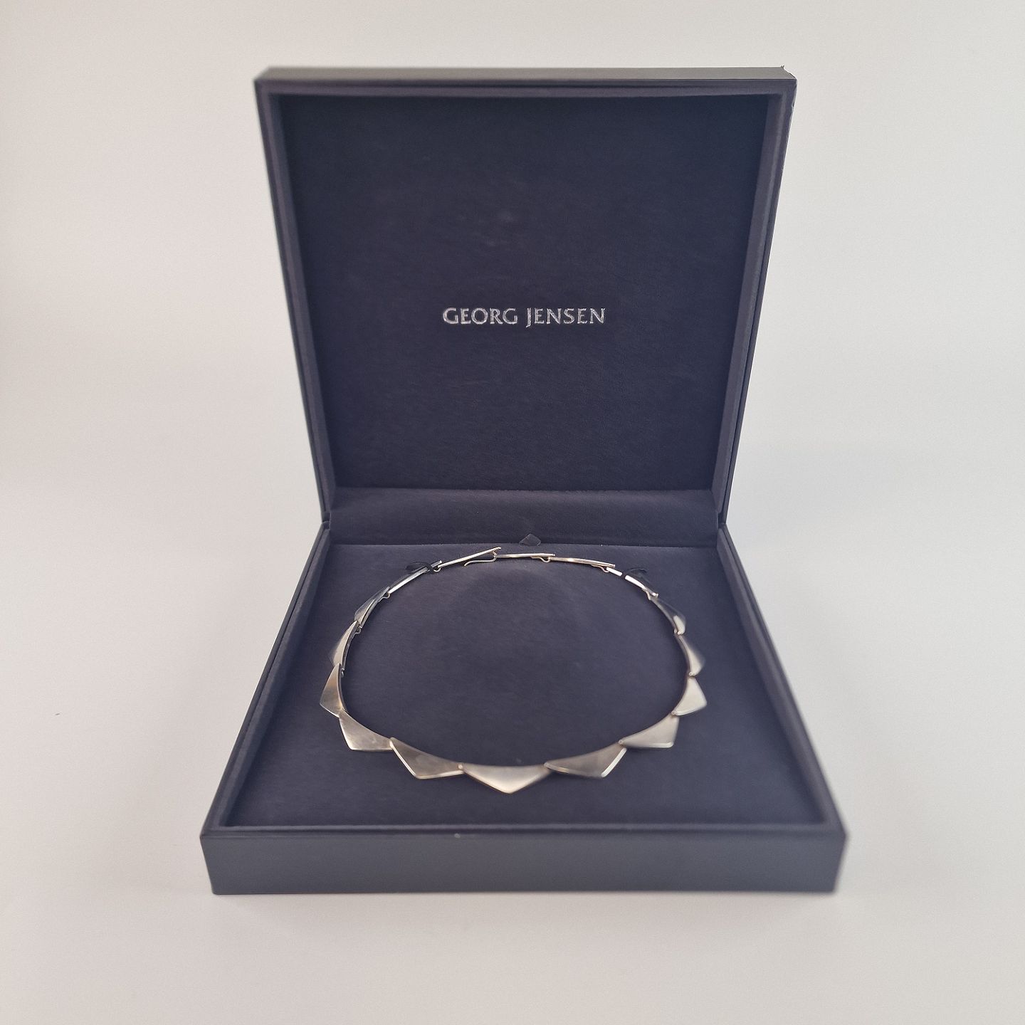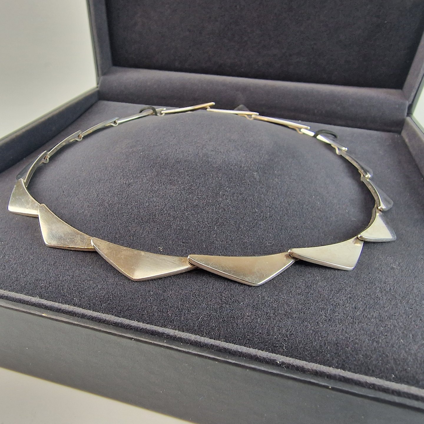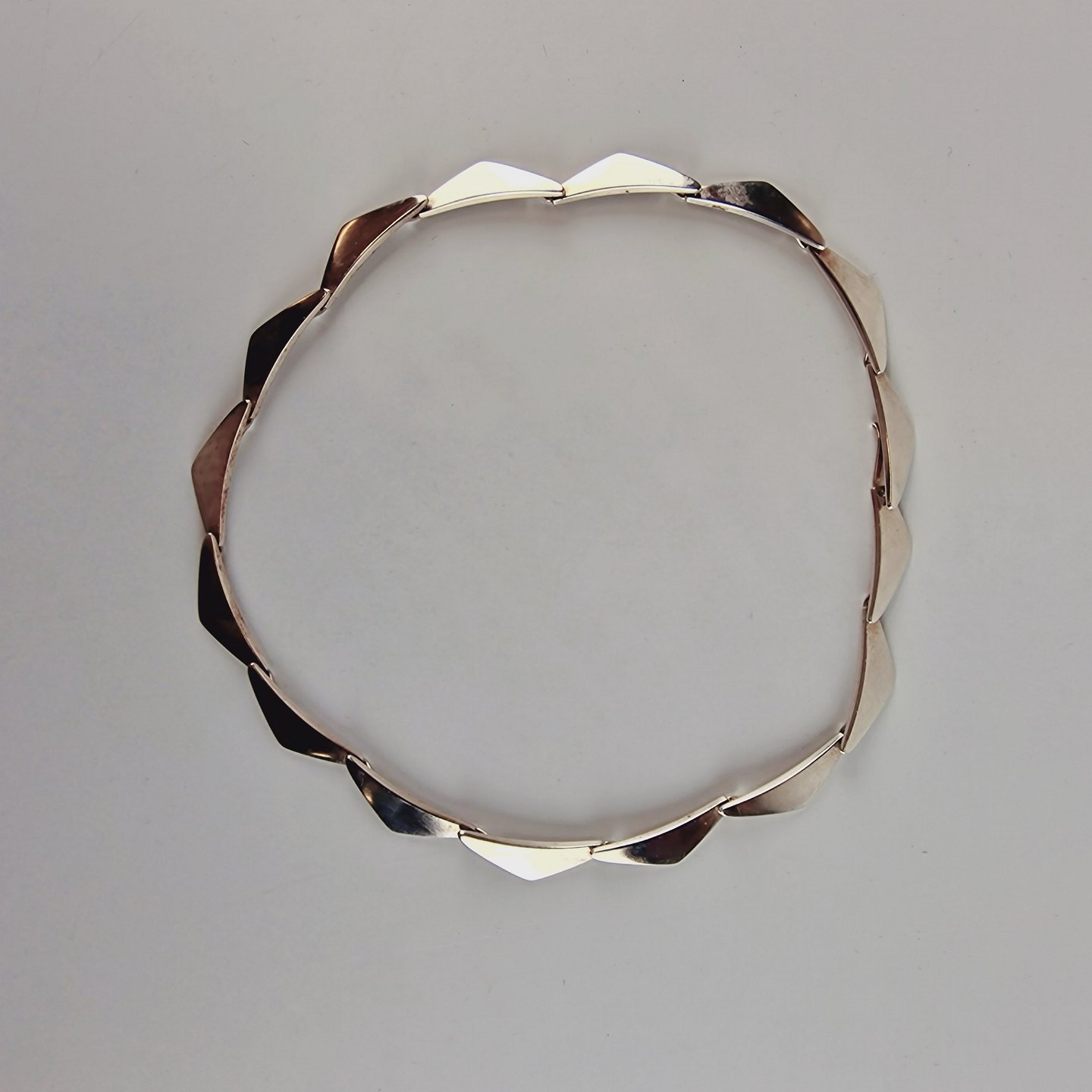 Halskæde af sterlingsølv. Med 16 led udformet som trekanter. Leveres i original æske