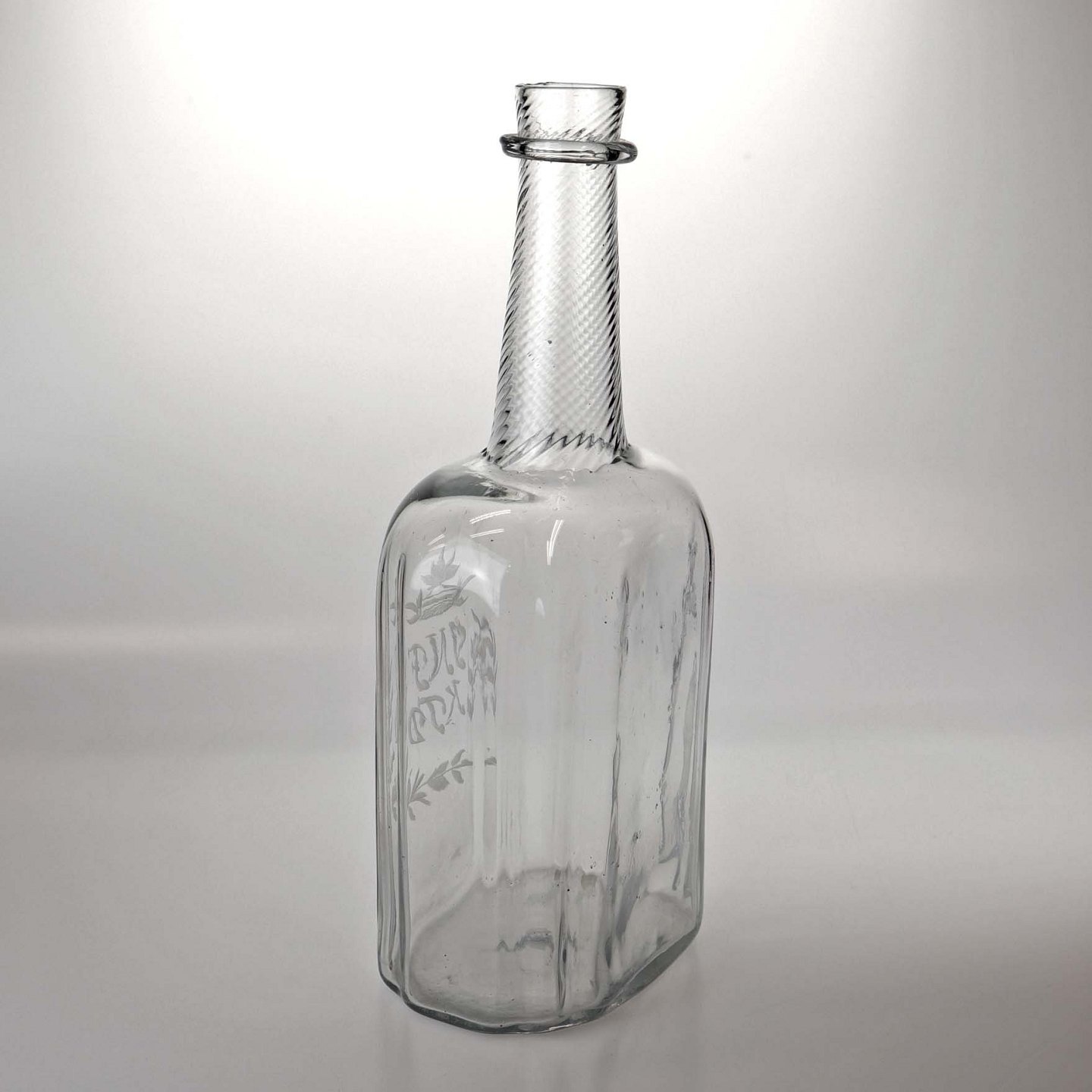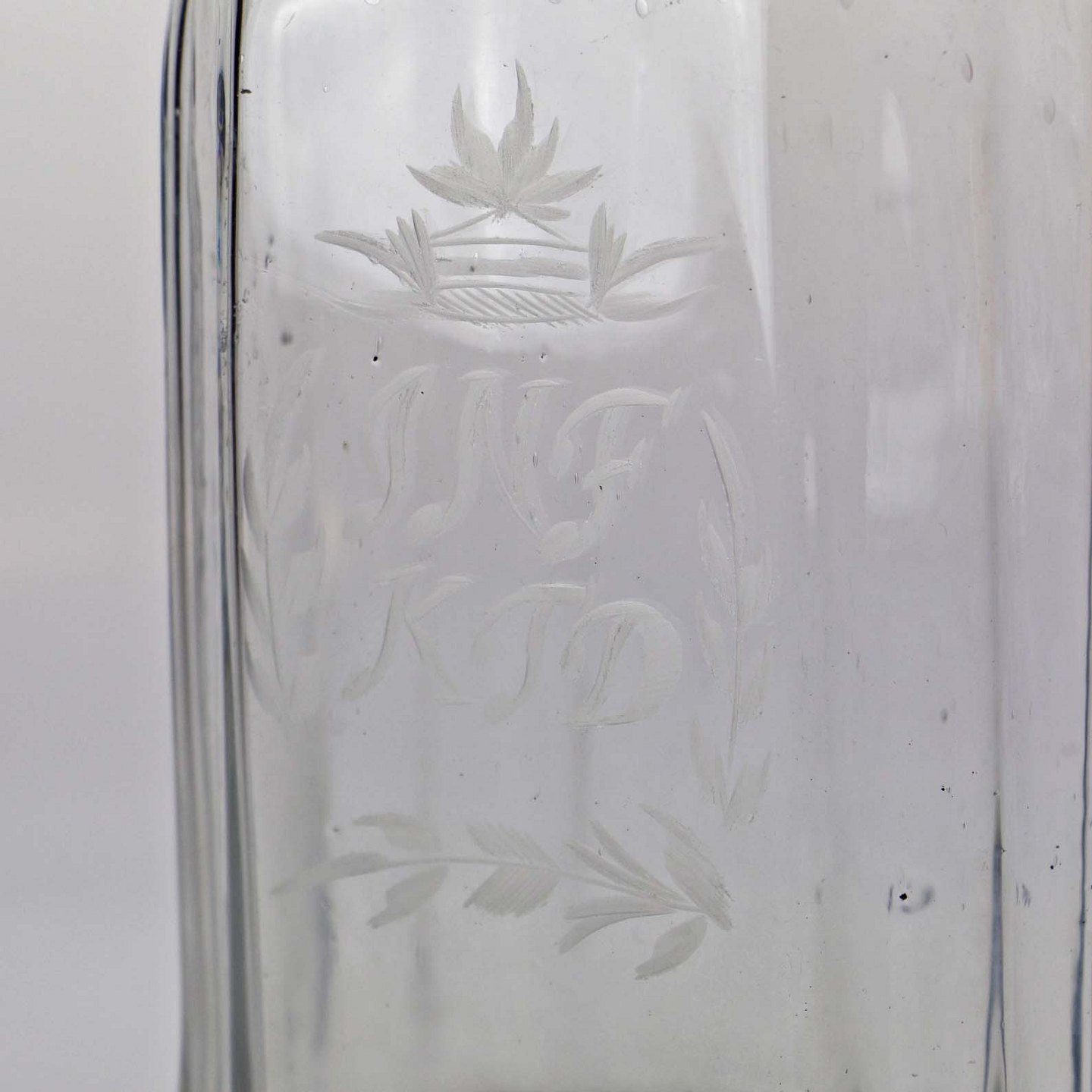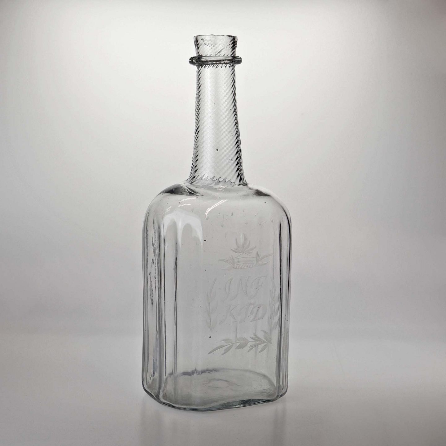 Karaffel med snoet hals. Initialerne I.N.F og K.T.D tyder monogram på ægtepar/brudepar