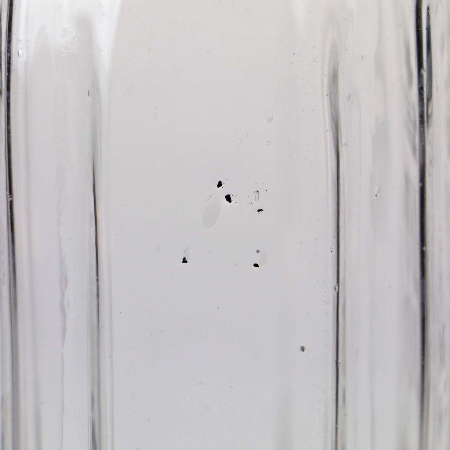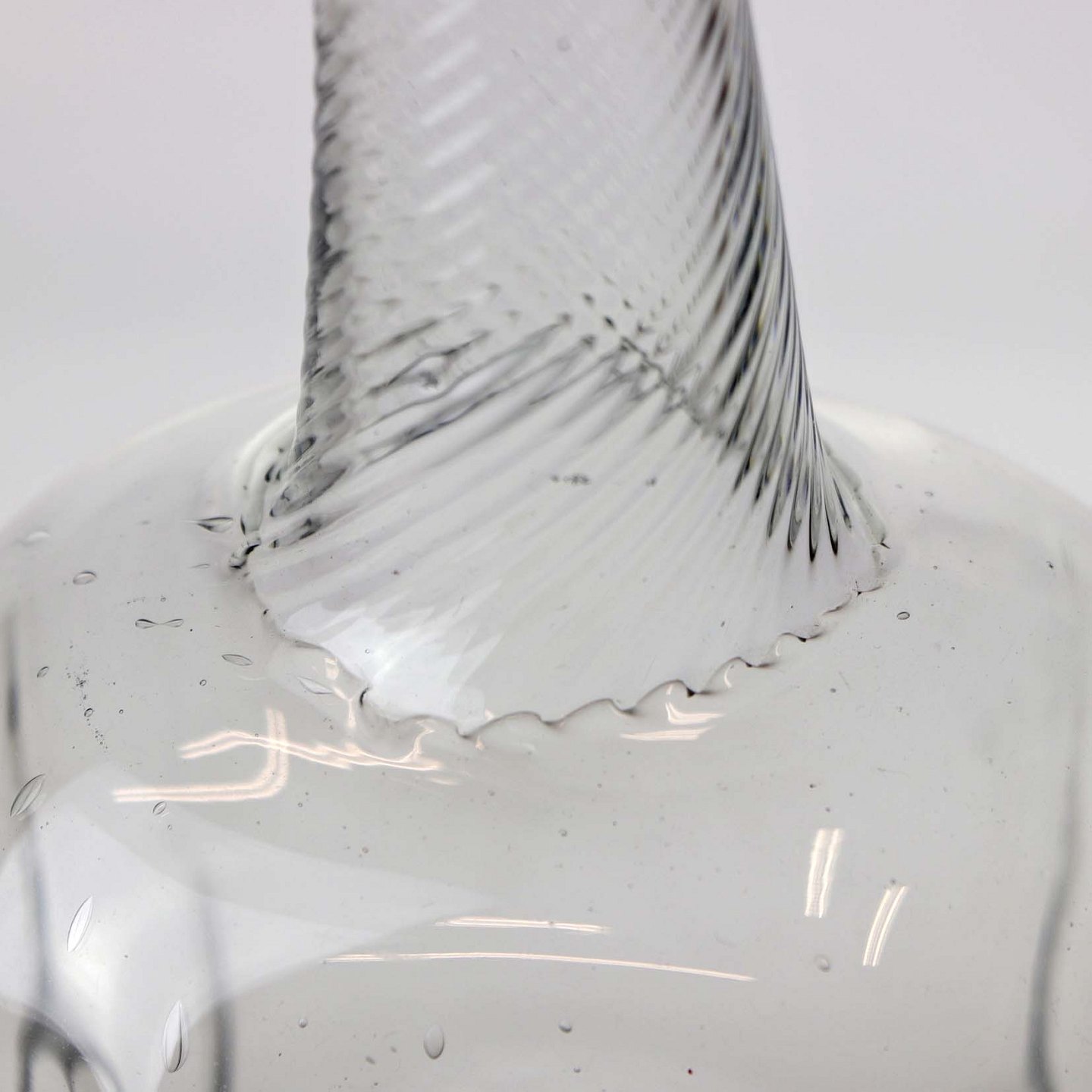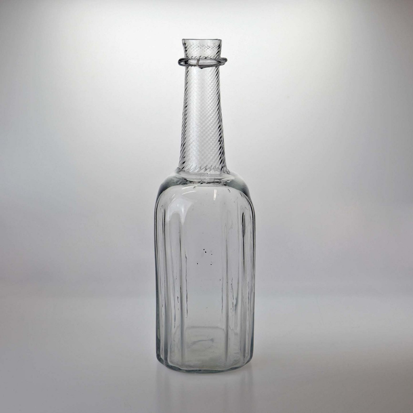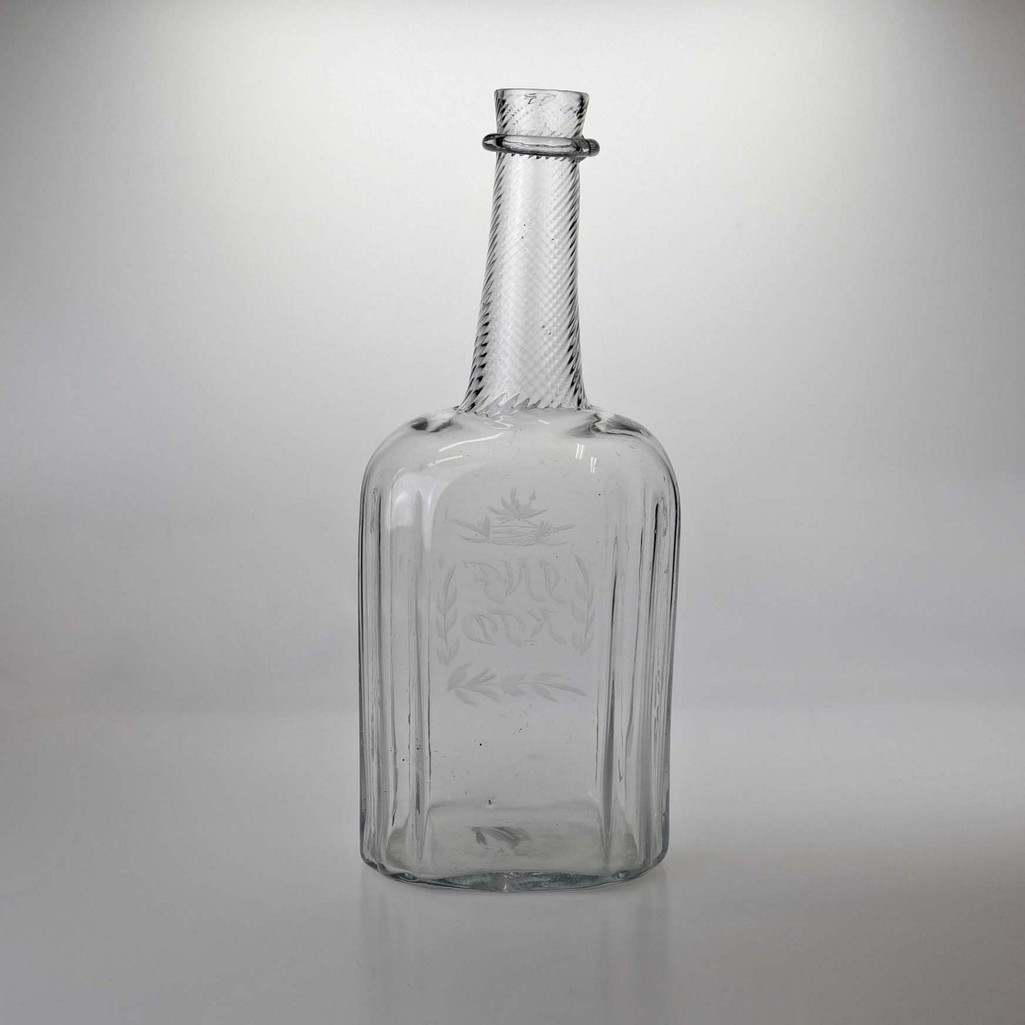 Karaffel med snoet hals. Initialerne I.N.F og K.T.D tyder monogram på ægtepar/brudepar