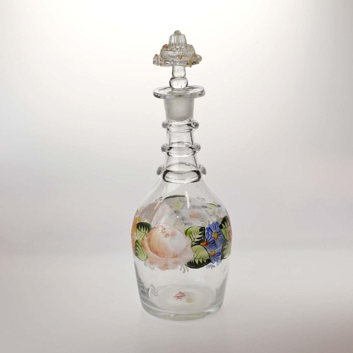 Karaffel dekoreret med blomster og blade af emalje maling.