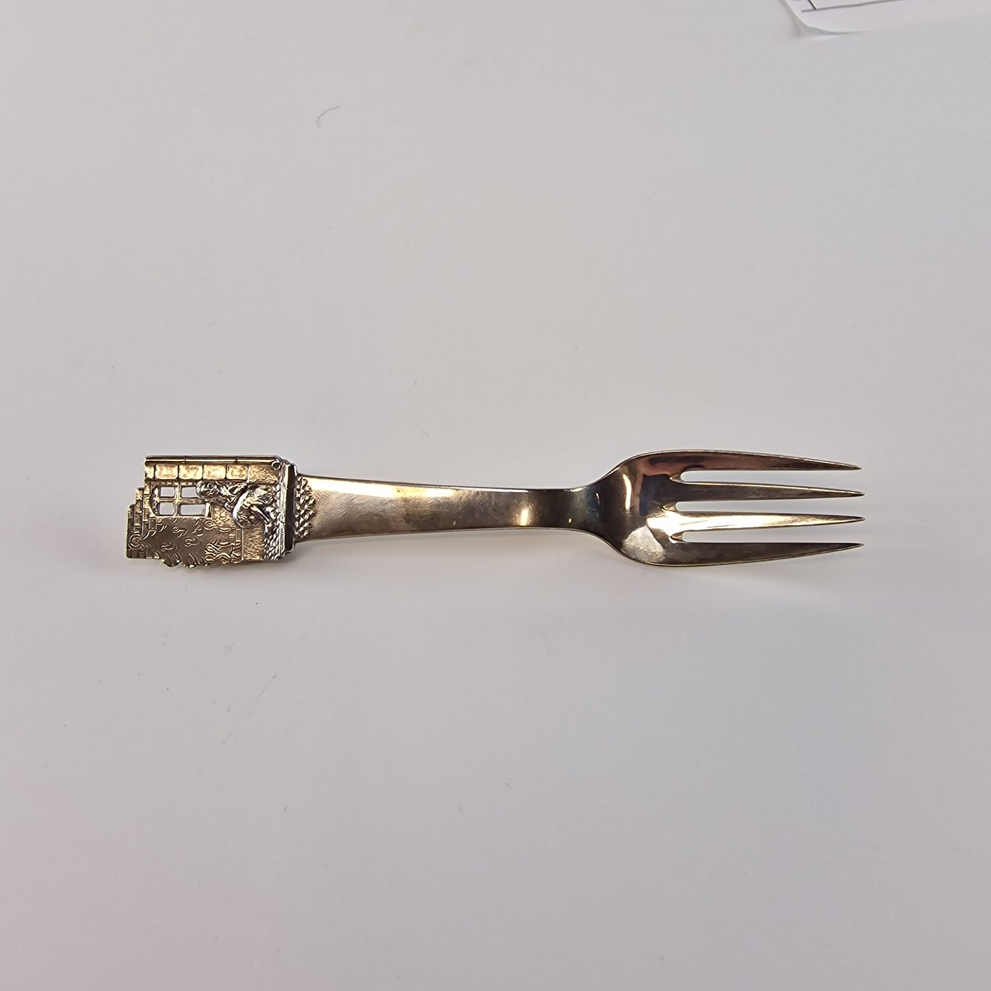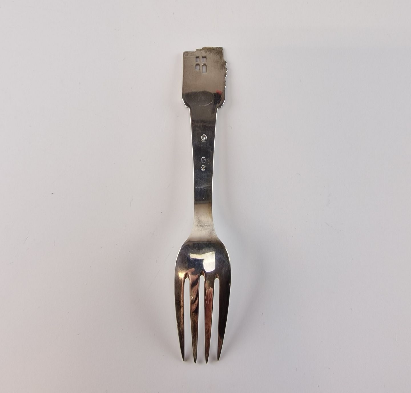 H.C. Andersen barnegaffel i sølv. Med motiv fra eventyret Den lille pige med svovlstikkerne. År 1947