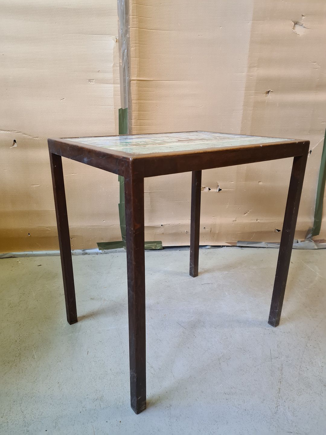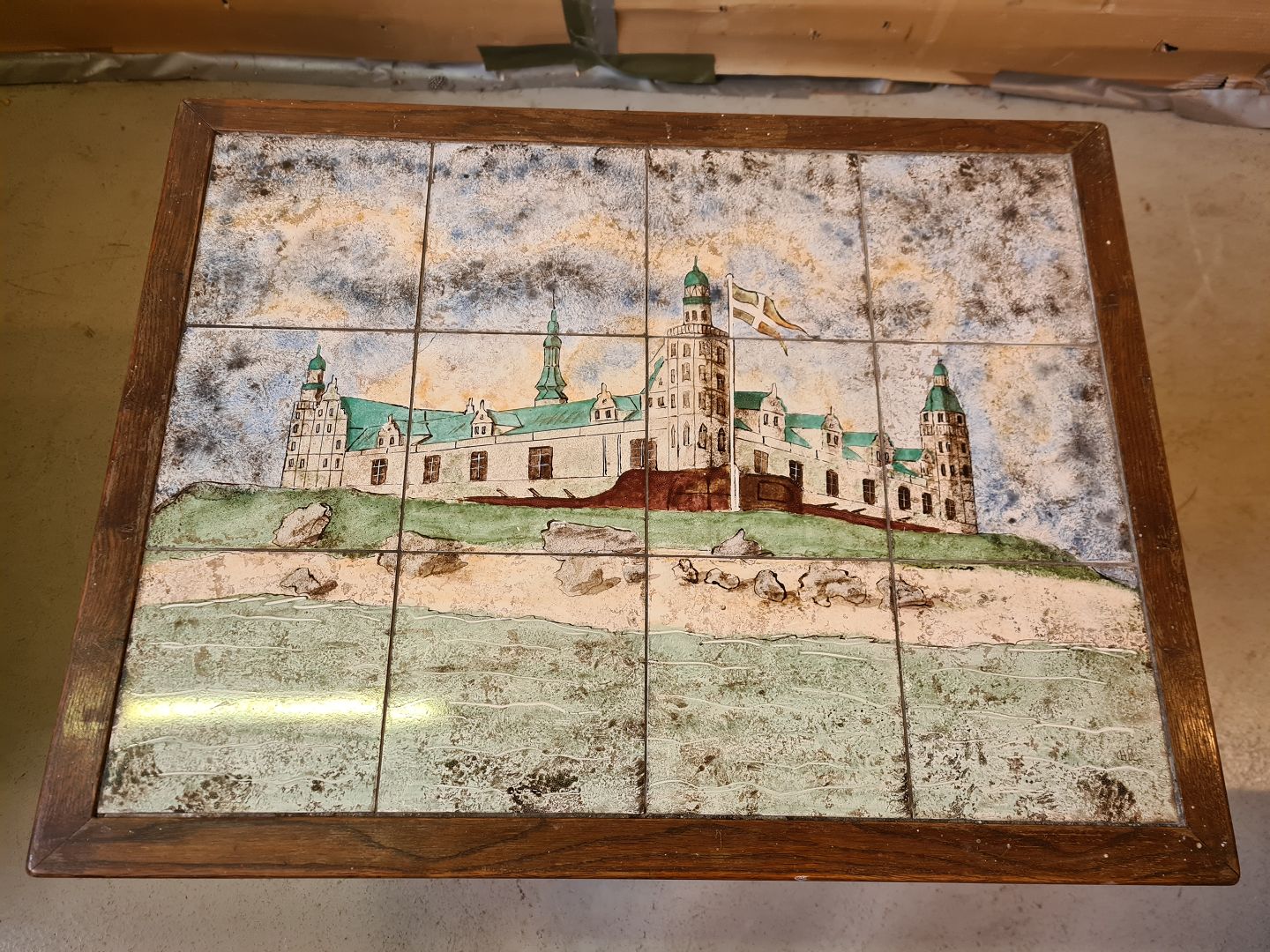 Bord i egetræ med Kronborg malet på kakler, fra 1960erne.