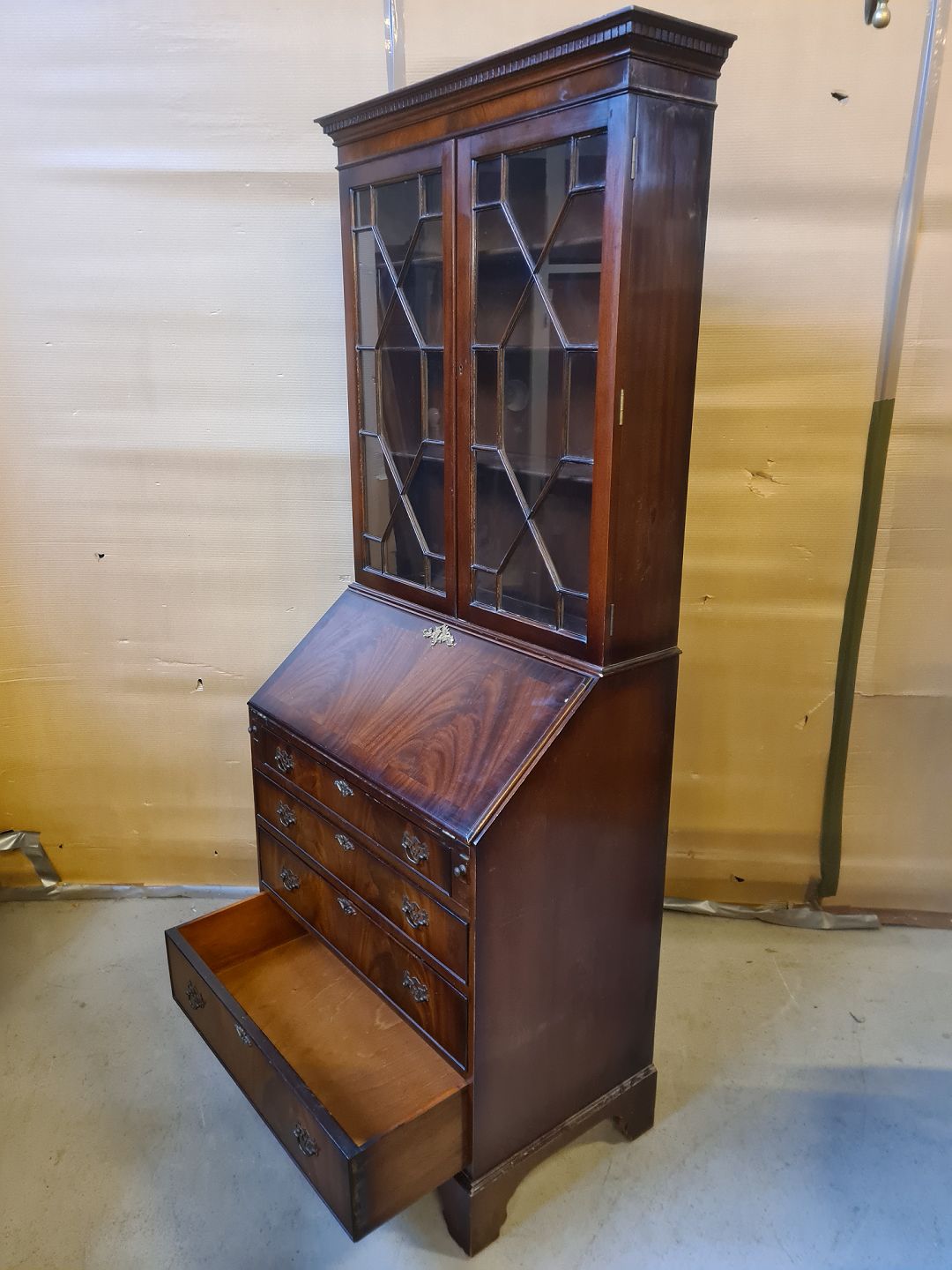 Chatol i fineret mahogni med vitrine overdel, fra 1980erne.