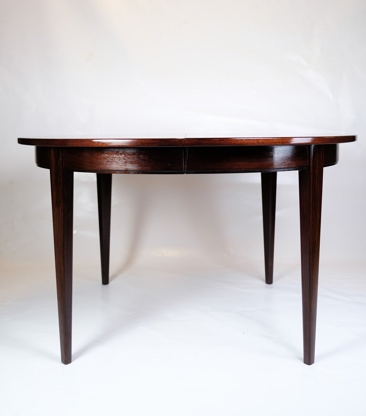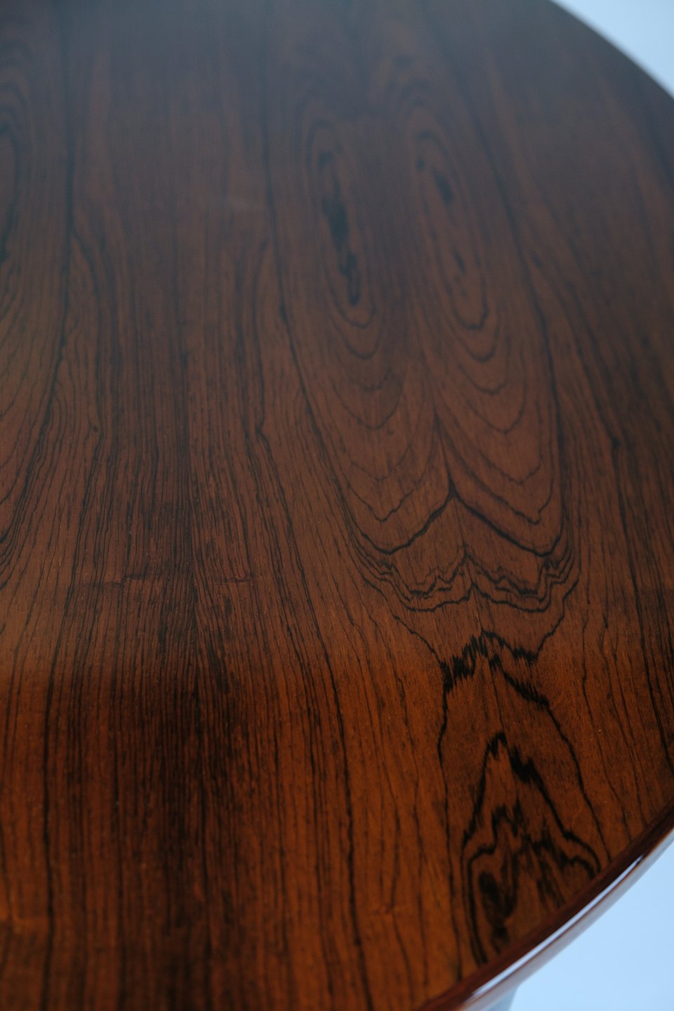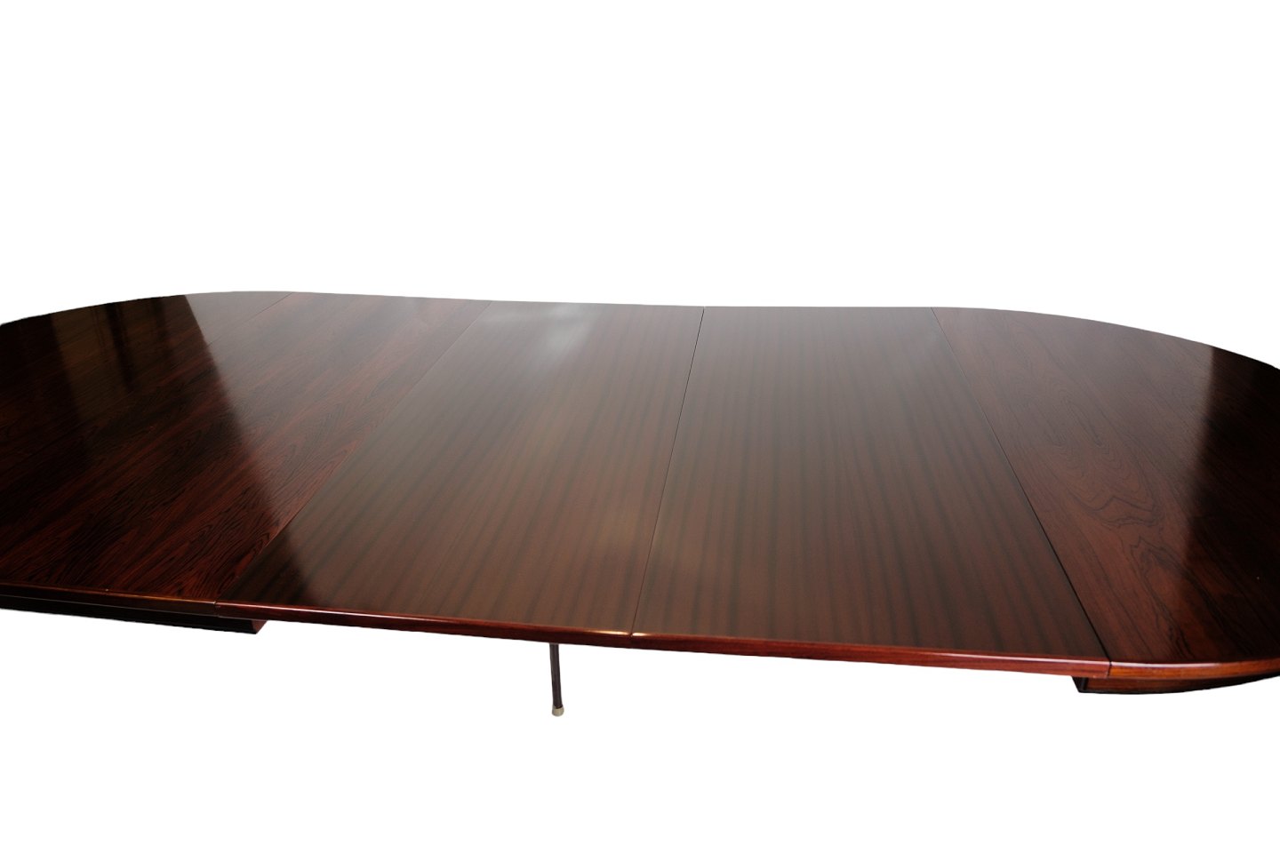 Et rundt spisebord af palisander, model 55 af Omann Junior medfølgende tre tillægsplader, hvoraf én har en sarg, fra omkring 1960'erne, er et eksempel på en æstetisk og praktisk spiseløsning fra den tid.