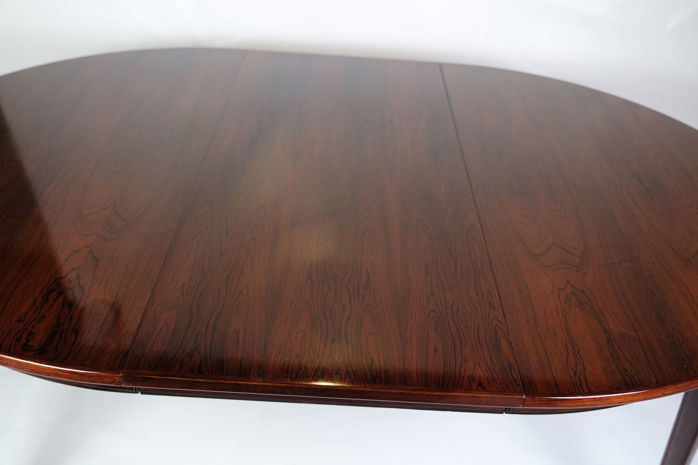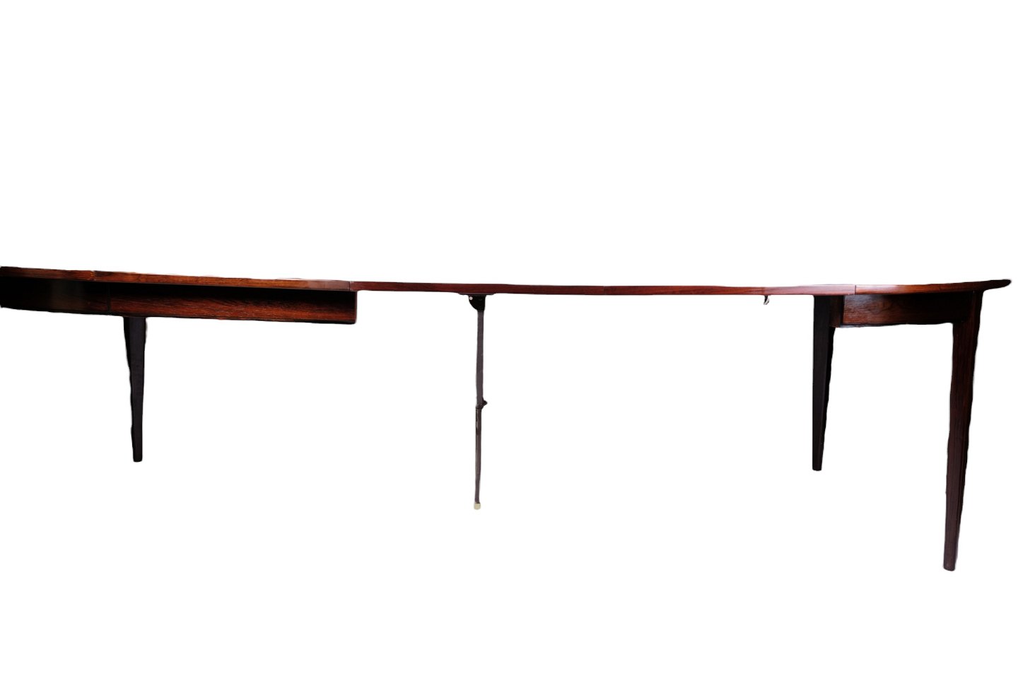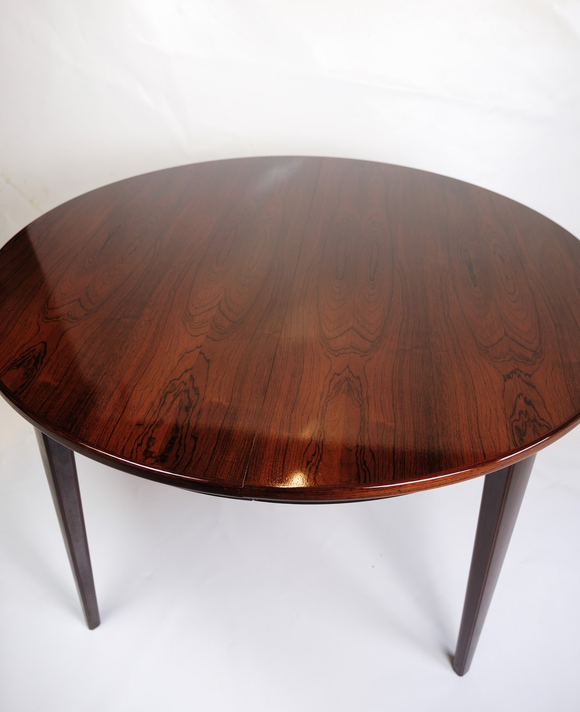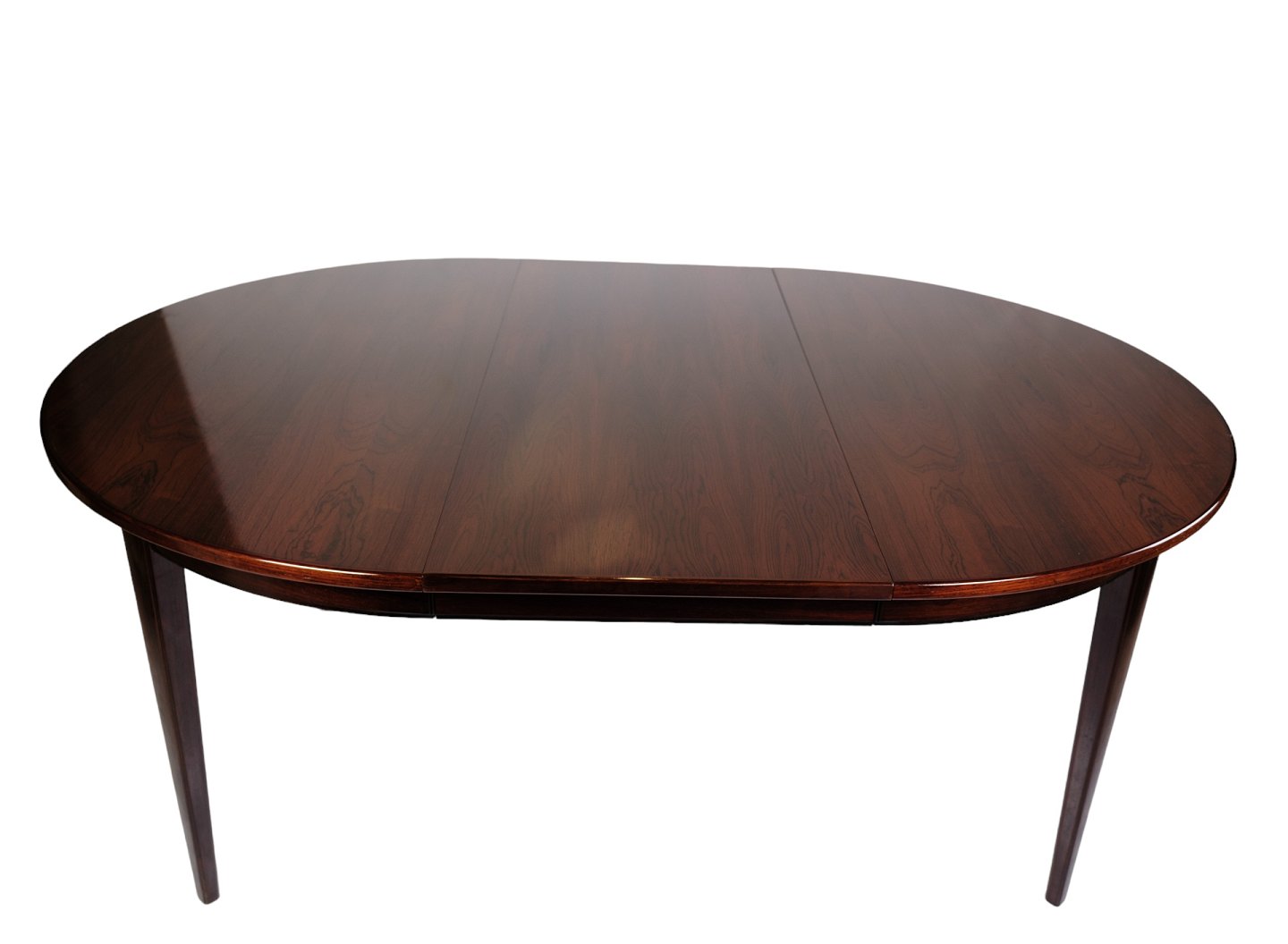 Et rundt spisebord af palisander, model 55 af Omann Junior medfølgende tre tillægsplader, hvoraf én har en sarg, fra omkring 1960'erne, er et eksempel på en æstetisk og praktisk spiseløsning fra den tid.