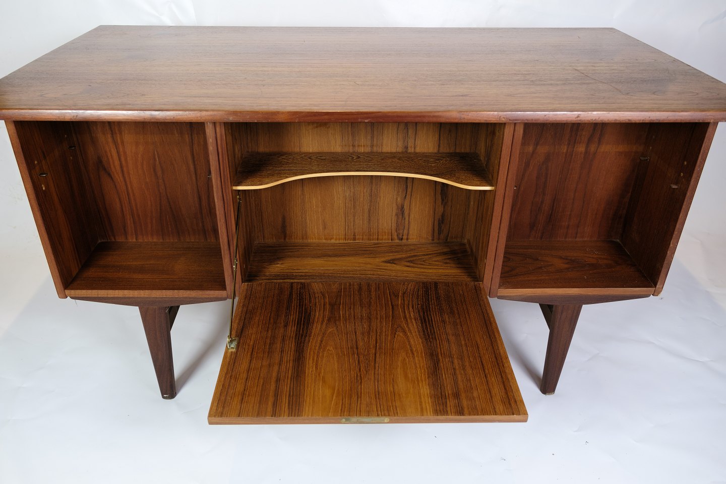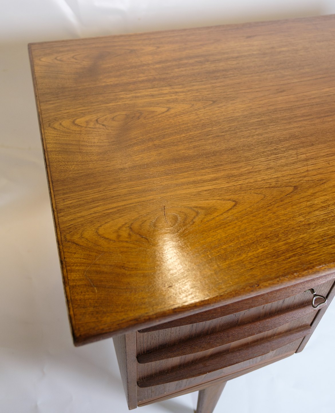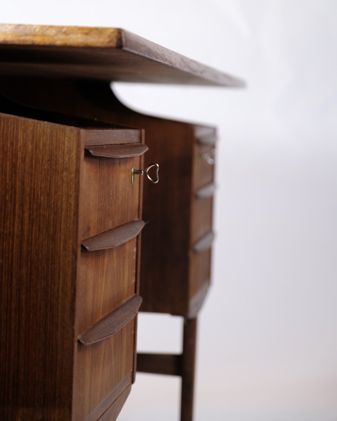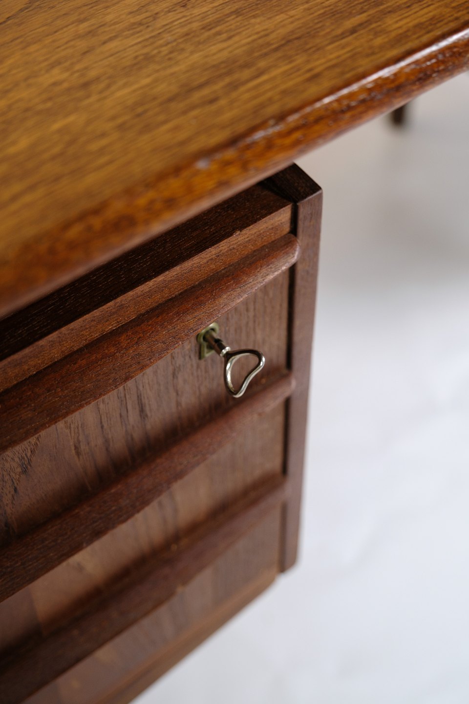 Dette skrivebord er et flot eksempel på dansk design fra 1960'erne, lavet af teaktræ. Et af de mest bemærkelsesværdige træk ved dette skrivebord er den svævende bordplade, der skaber en luftig og let visuel æstetik.