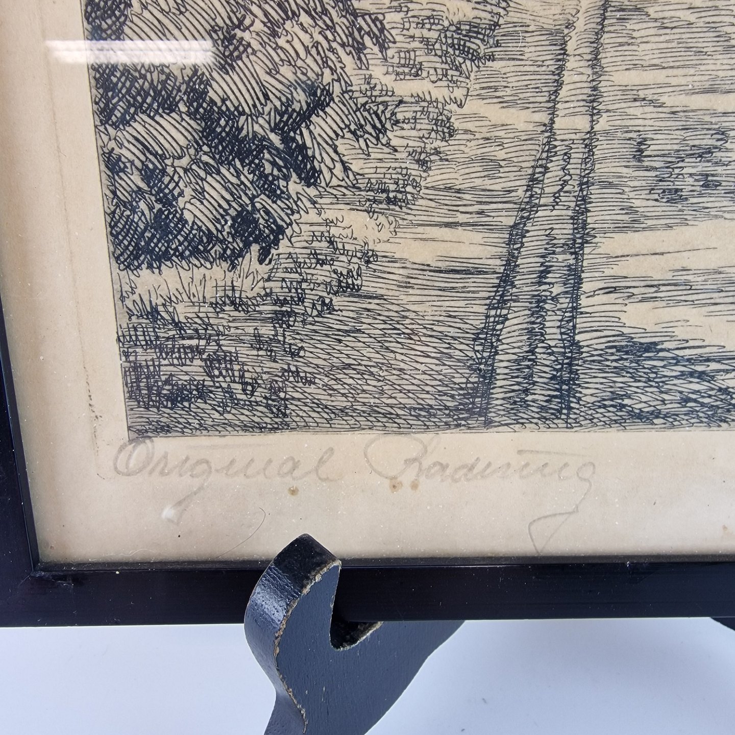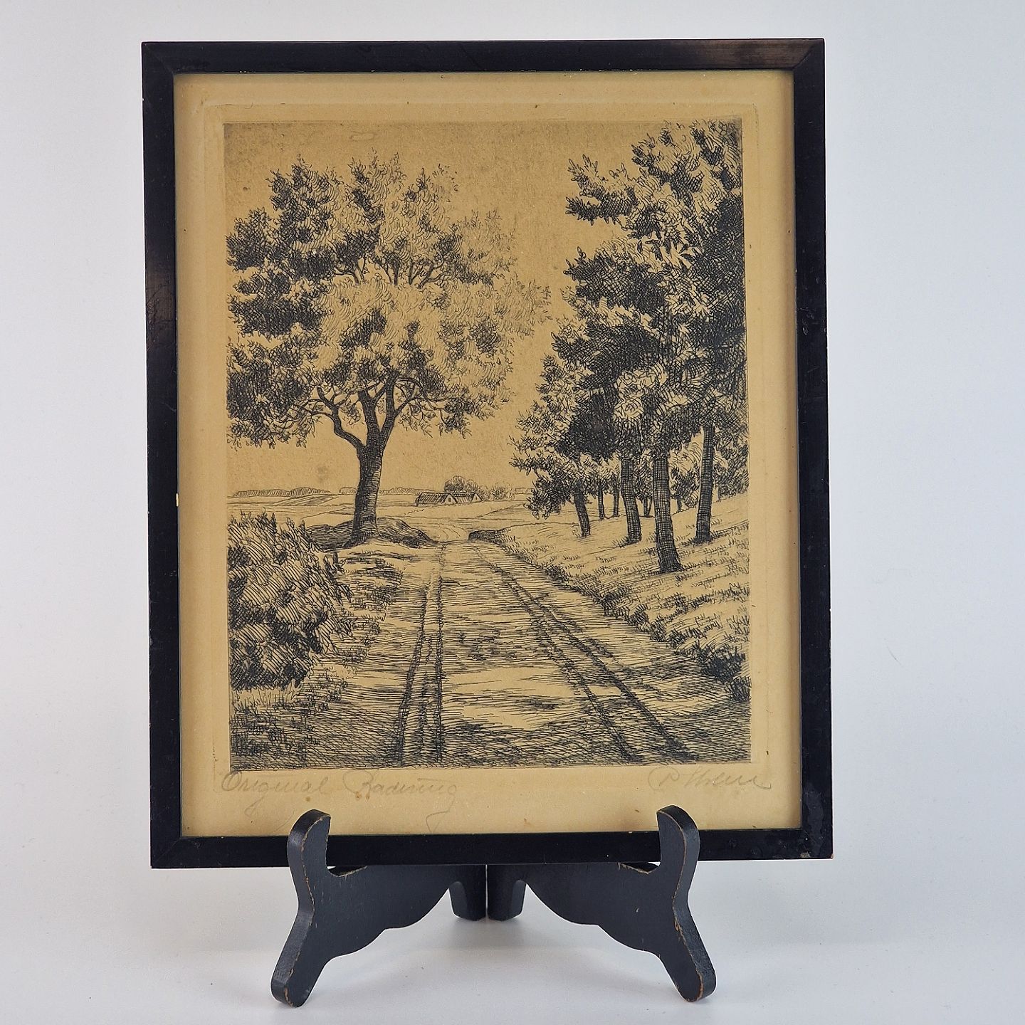 Original radering i sort og hvid med landskabmotiv. Landevej med to hjulspor omgivet af træer og en gård i det fjerne
