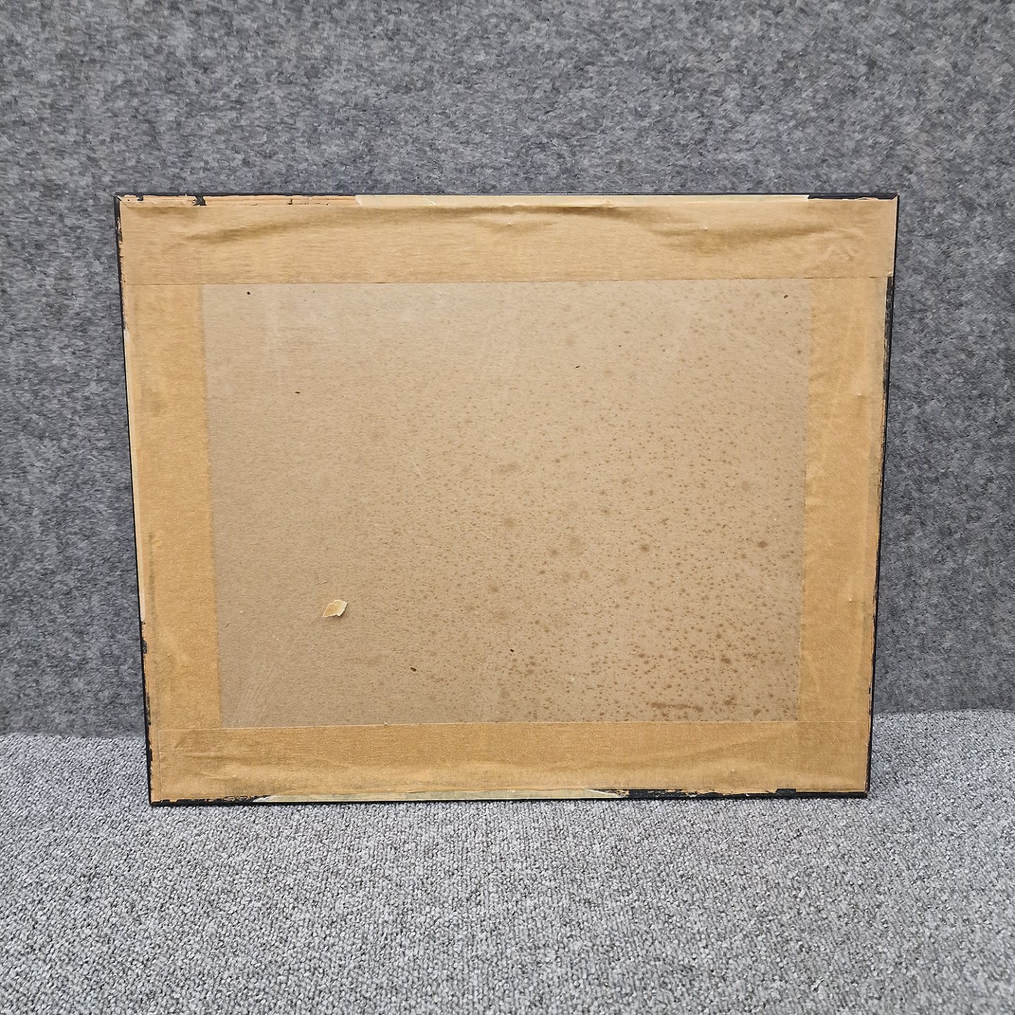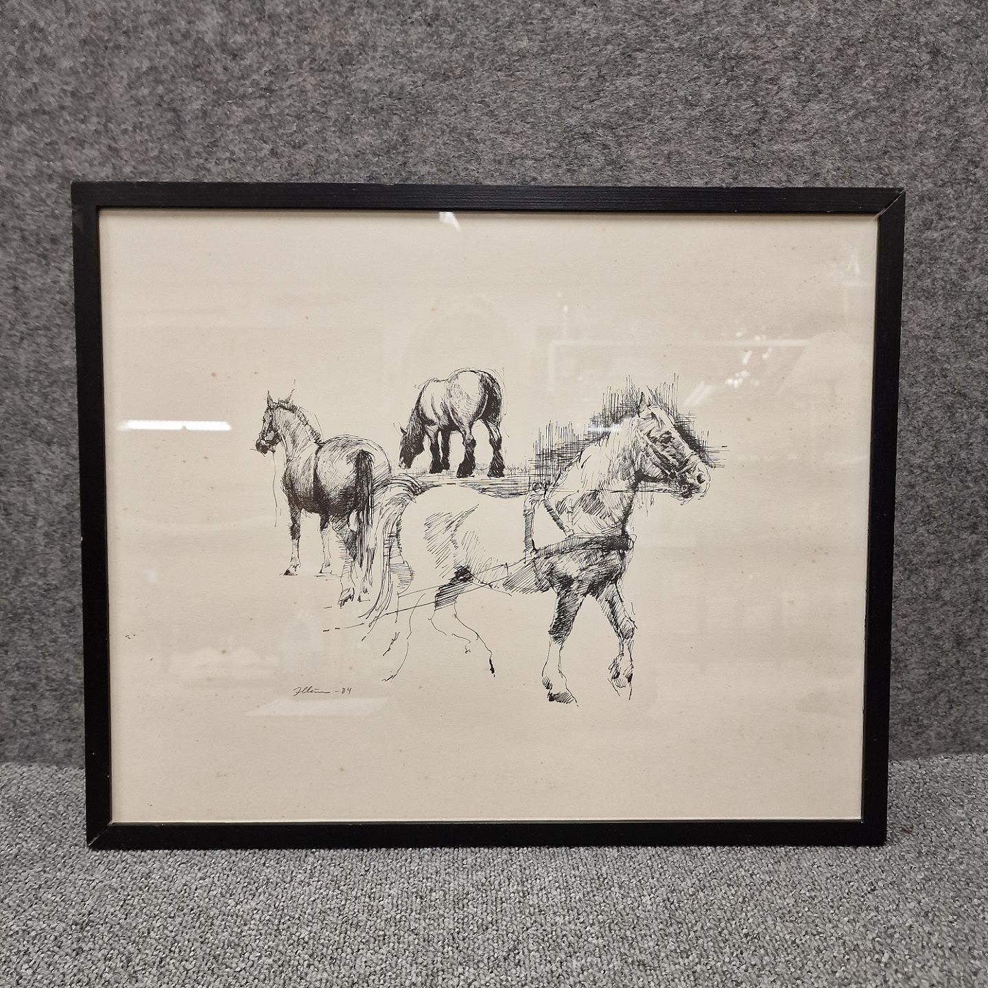 Indrammet tegning med træramme. Skitse i sort fineliner med motiv af tre heste