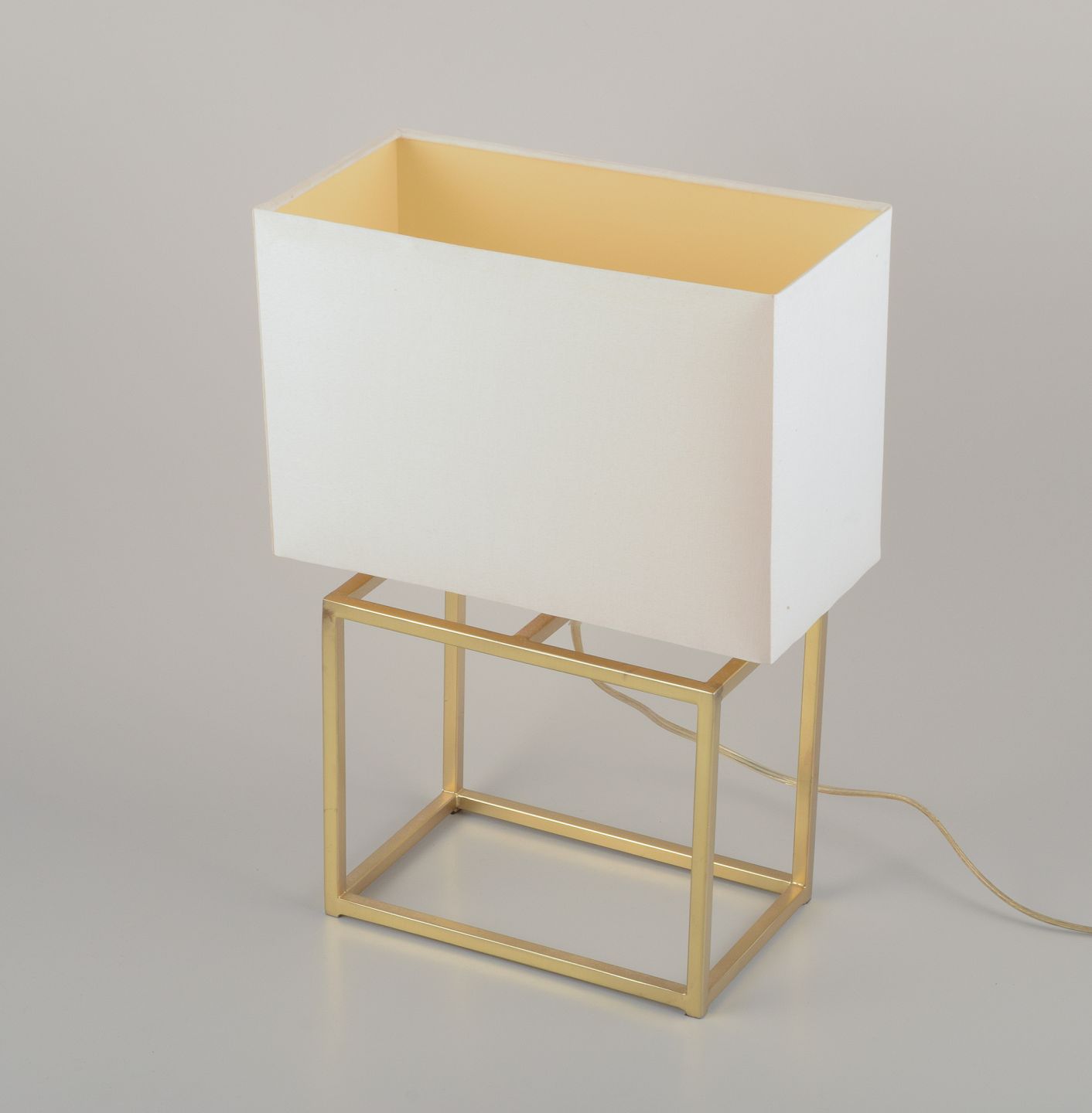 Designer bordlampe i messing med hvid skærm i stof. Modernistisk og stilrent design.