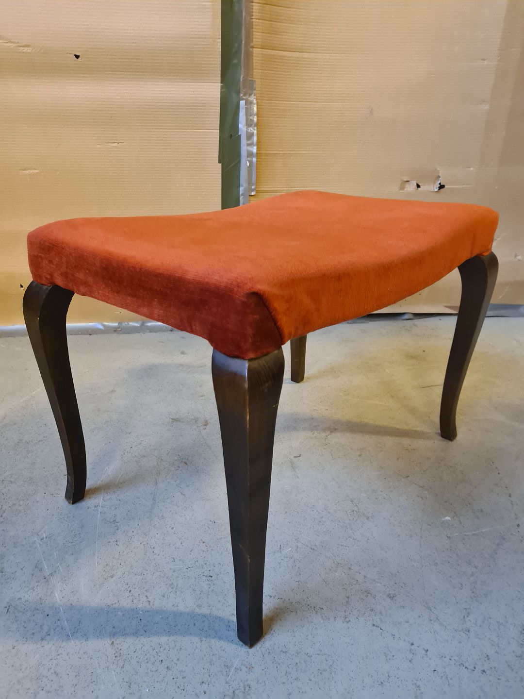 Skammel i egetræ med velourbetræk, fra 1940erne.