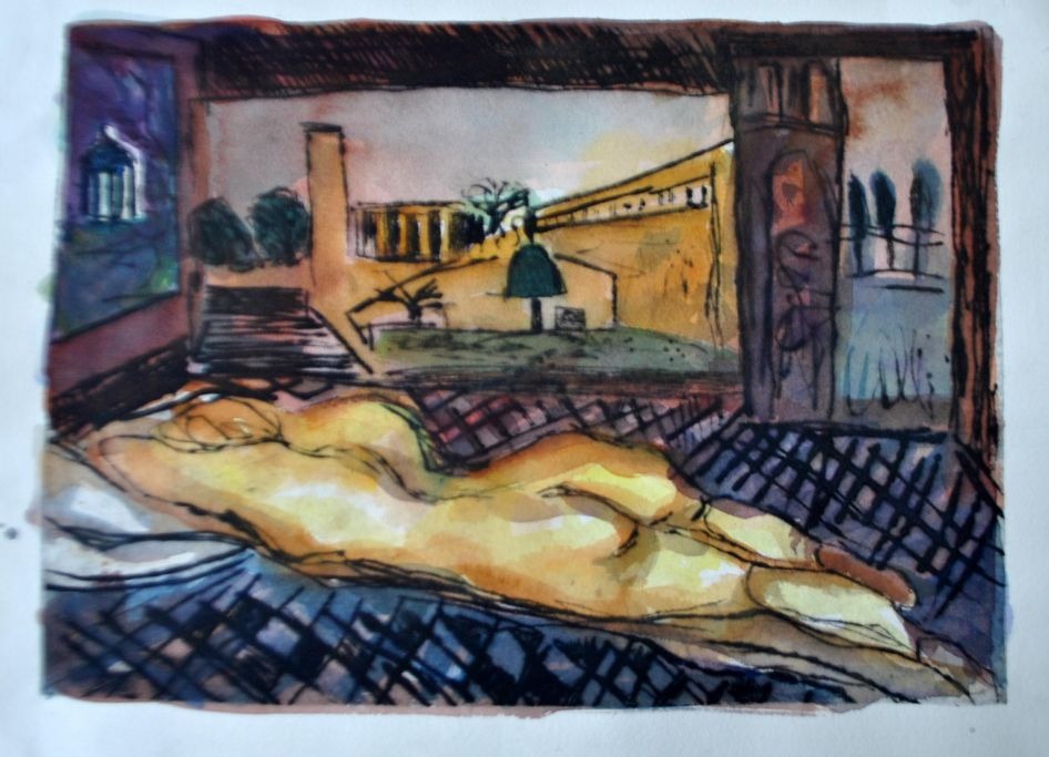 Degett, Karen (1954 - 2011) Danmark: Liggende kvinde. Radering med håndkoloreret akvarel. Usigneret. 30 x 39 cm.