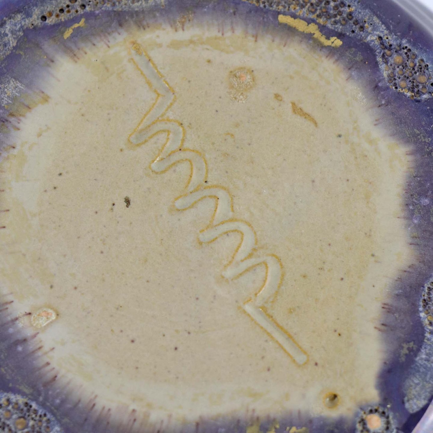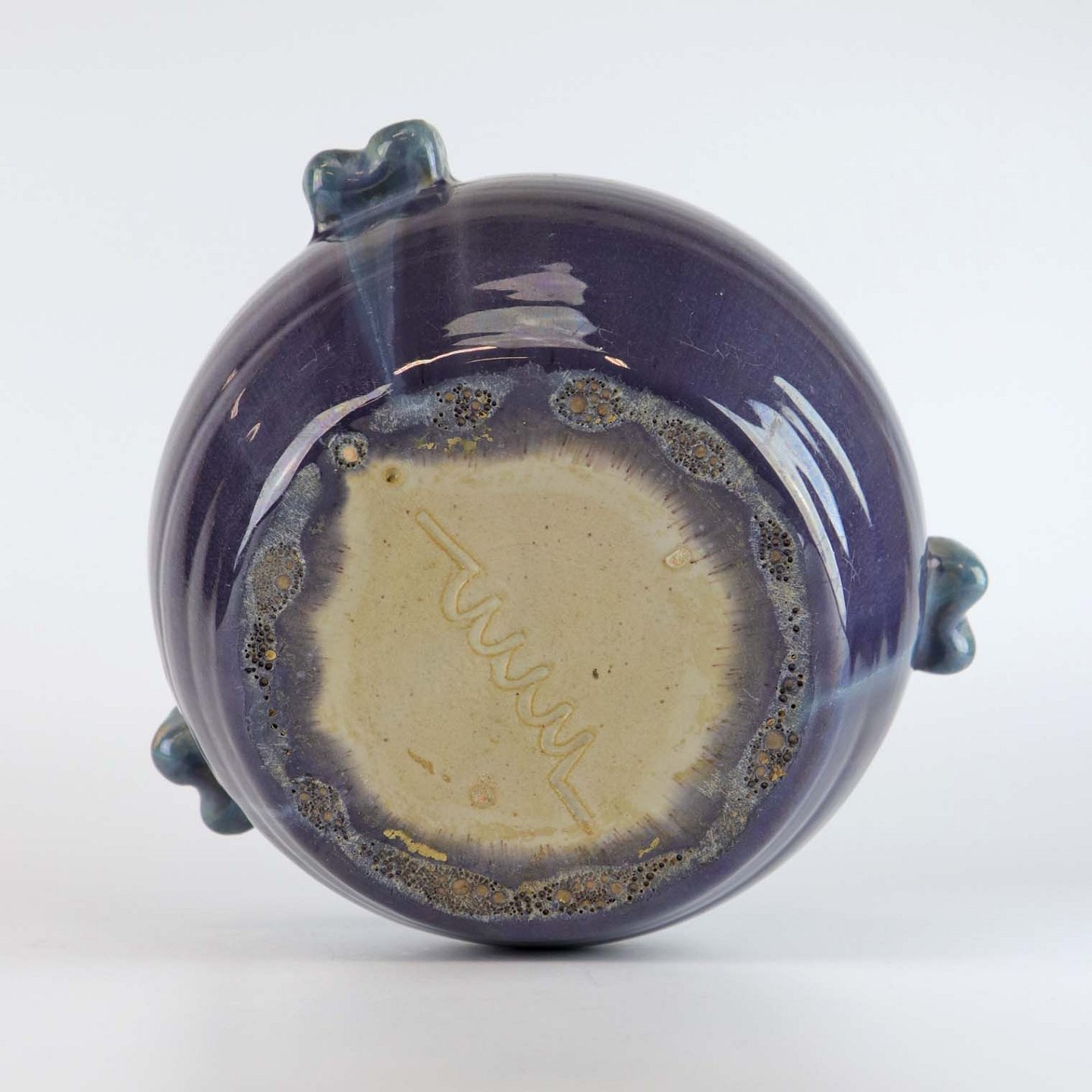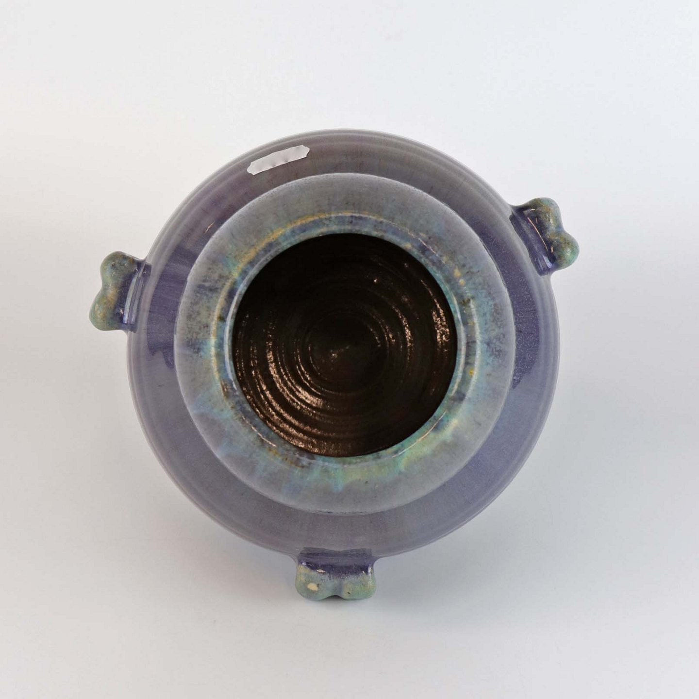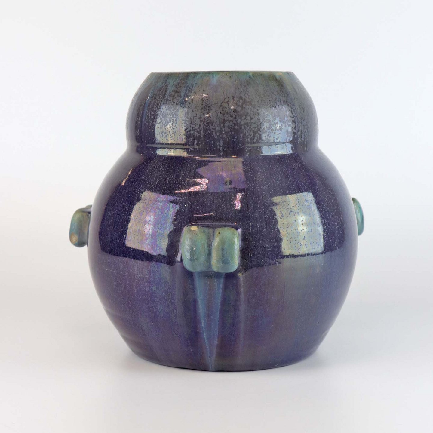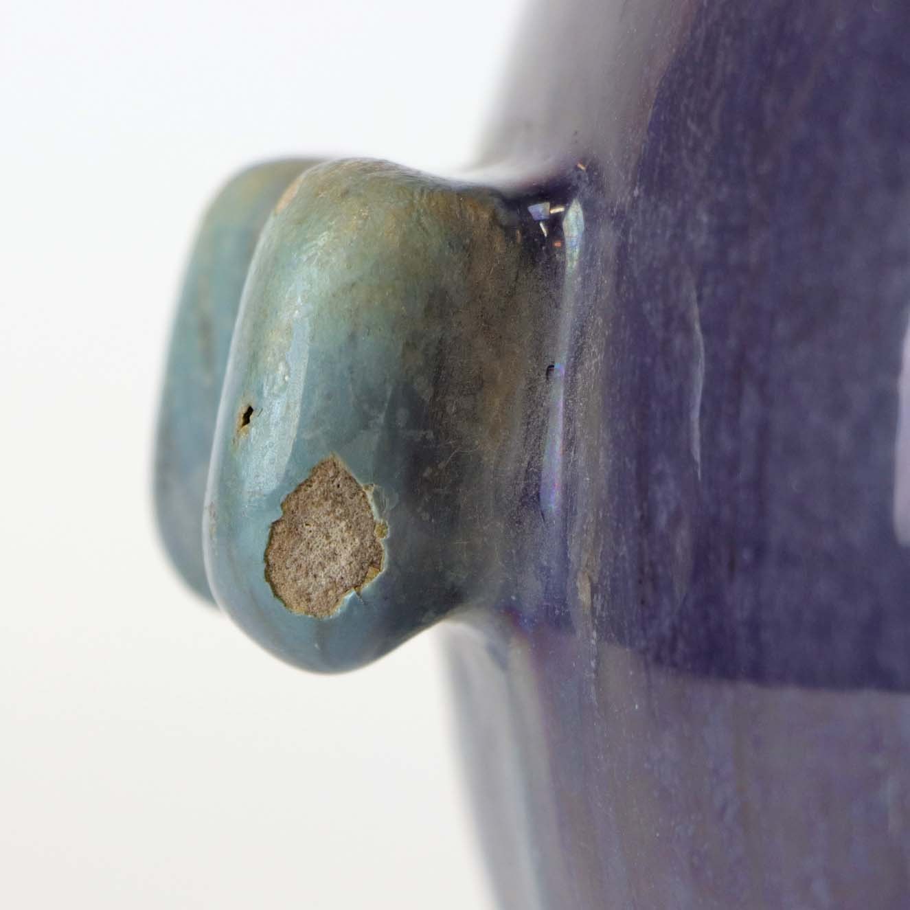 Vase af keramik, glaseret i blå og grønne nuancer som giver en lilla overflade. Fremstillet år 1939