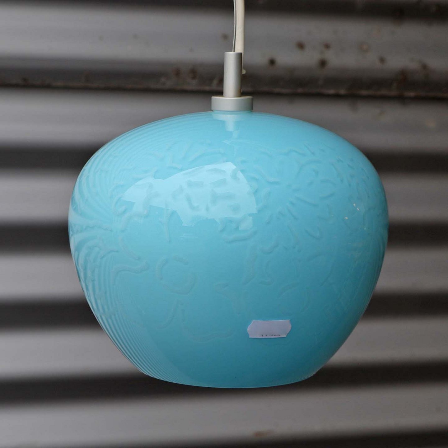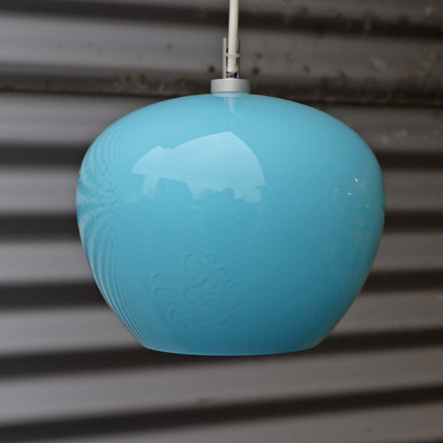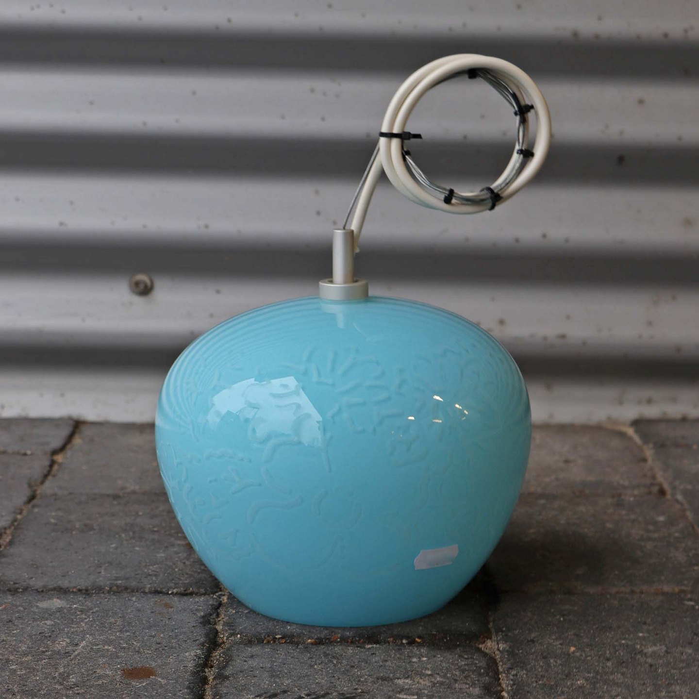 Pendel i lys blå mundblæst glas med blomstermotiver og porcelænsfatning