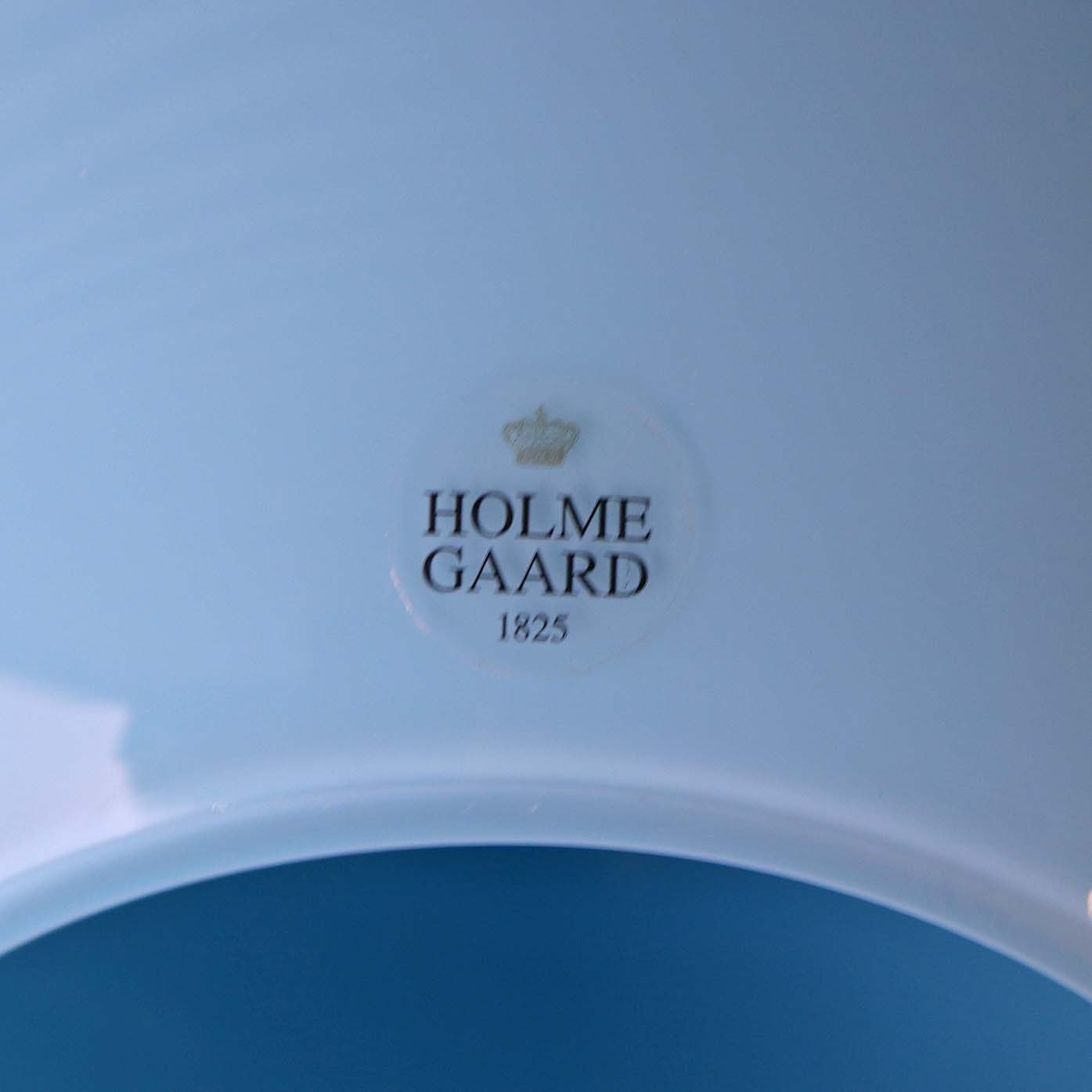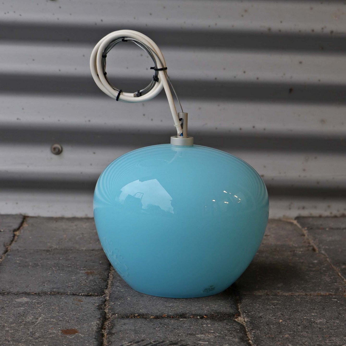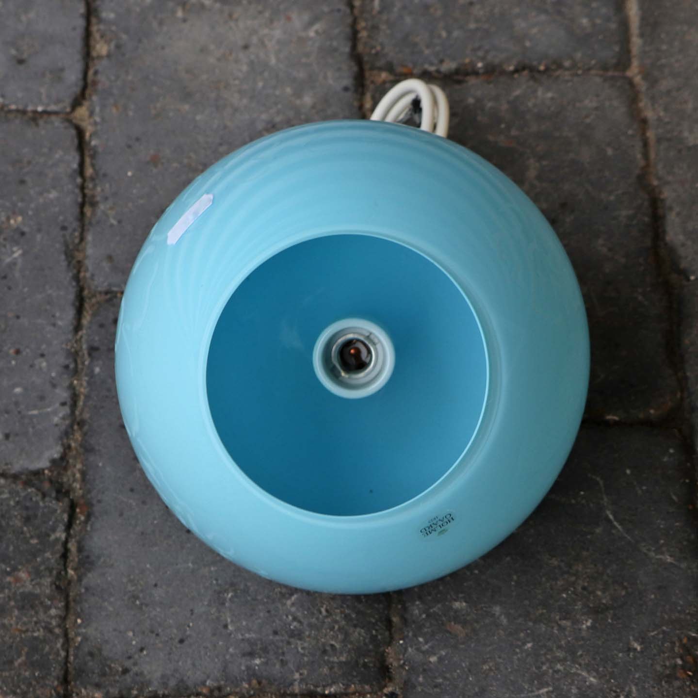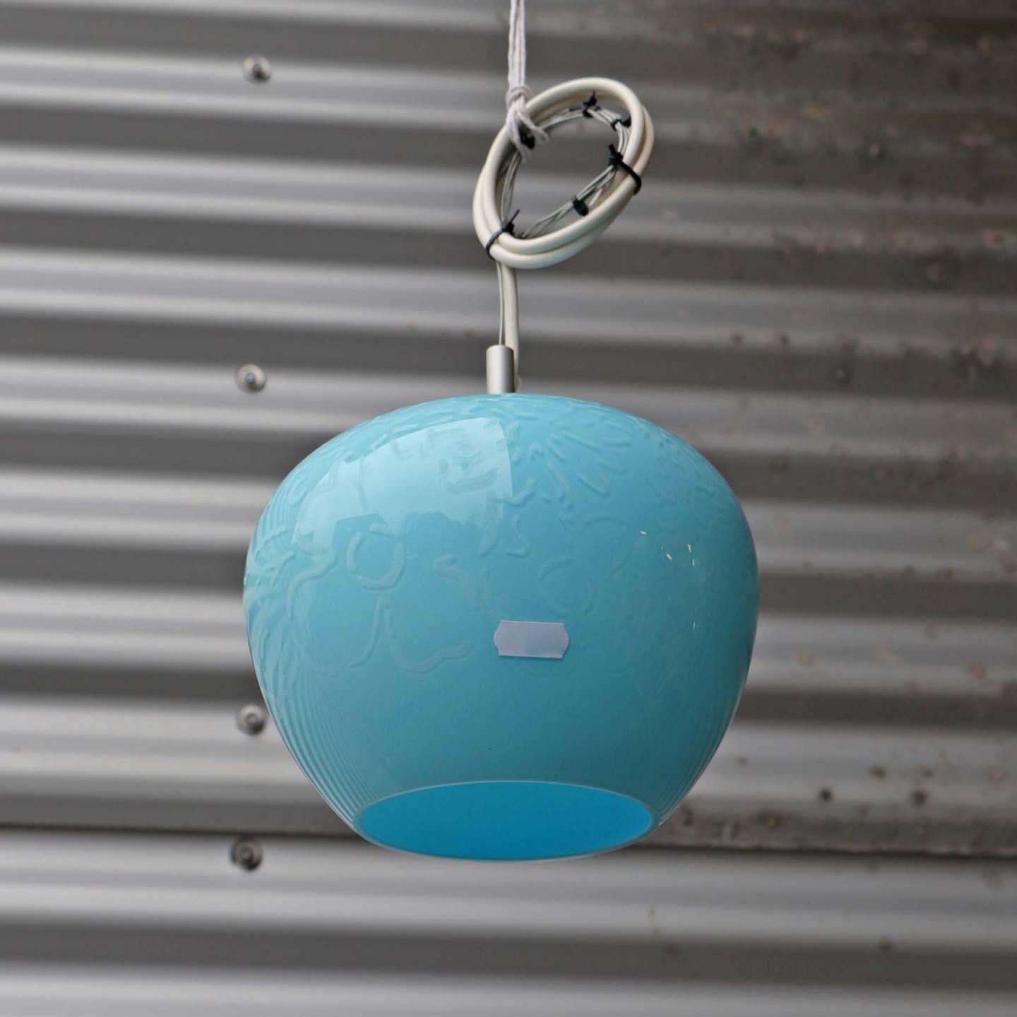 Pendel i lys blå mundblæst glas med blomstermotiver og porcelænsfatning