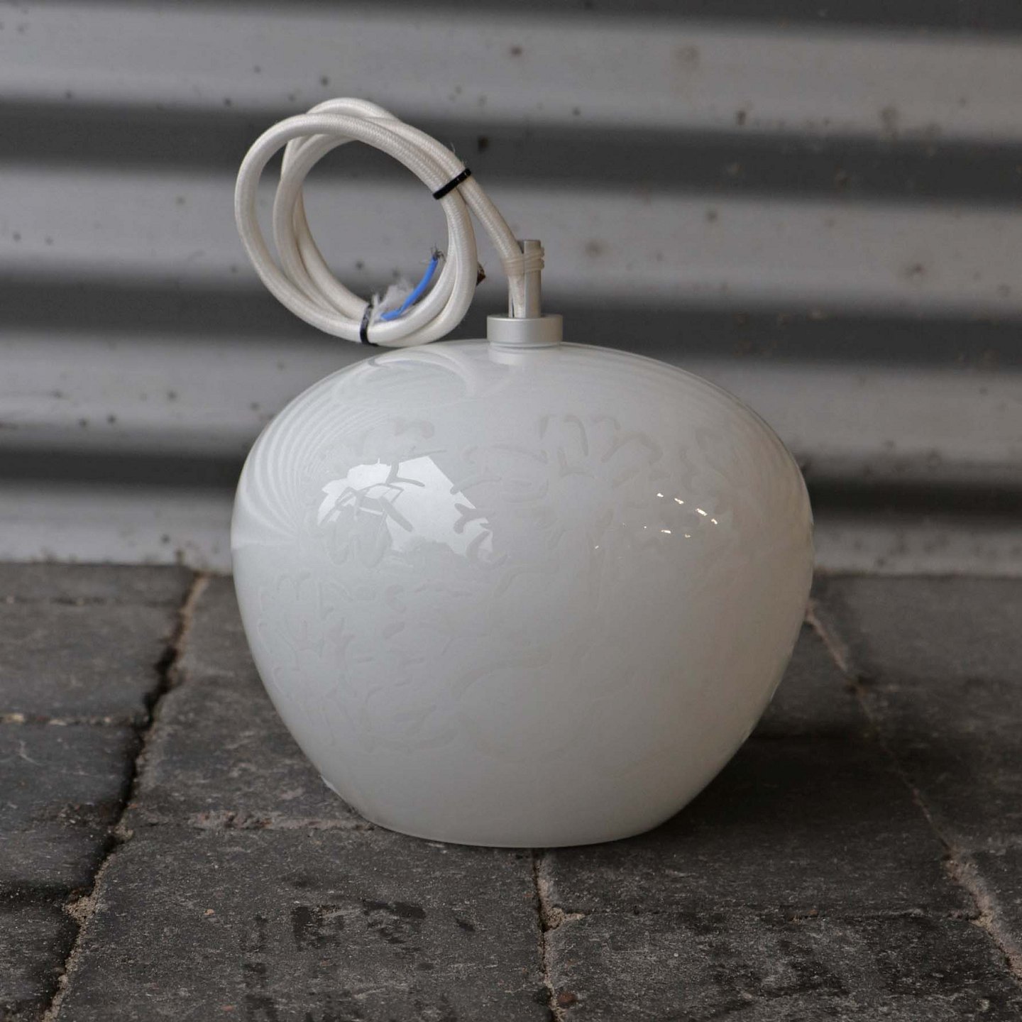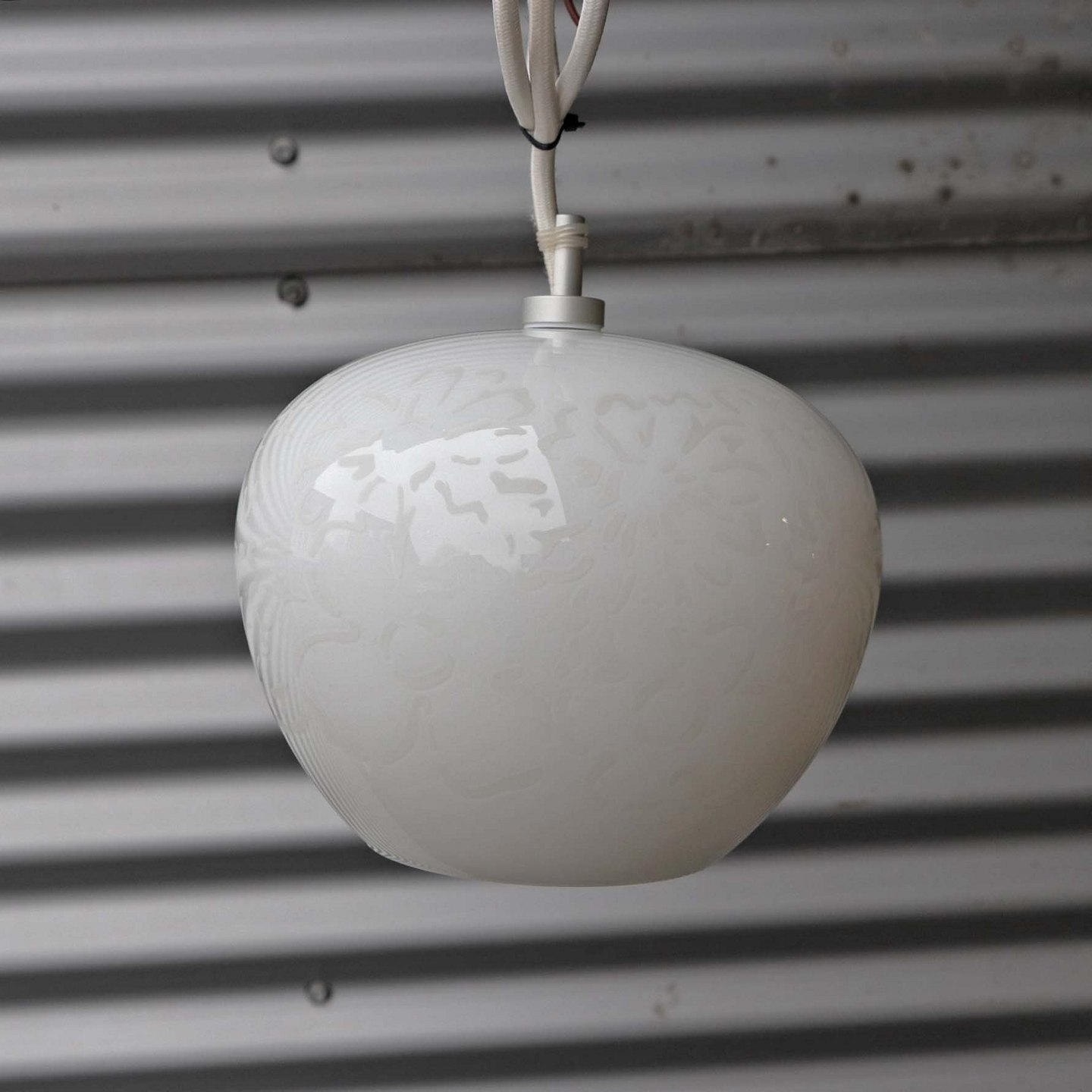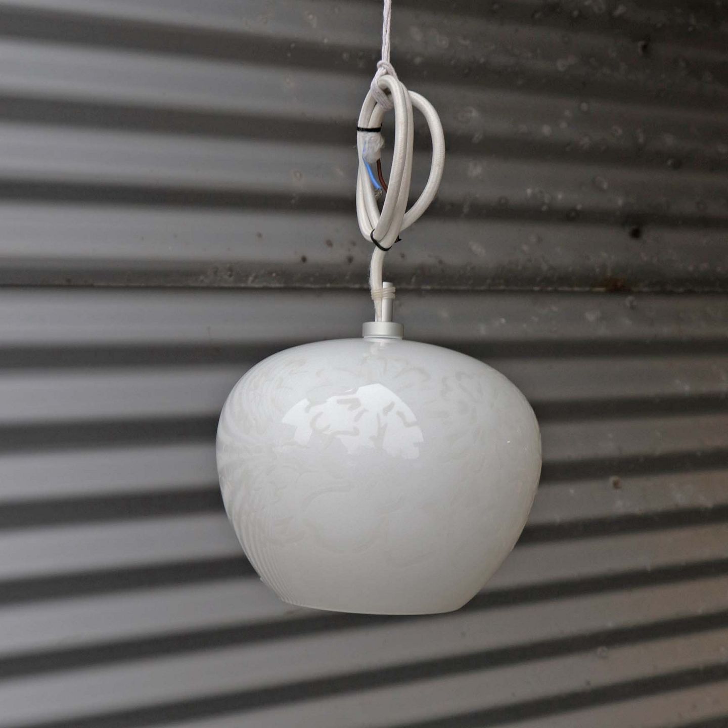 Pendel i hvidt mundblæst glas med blomstermotiver og porcelænsfatning
