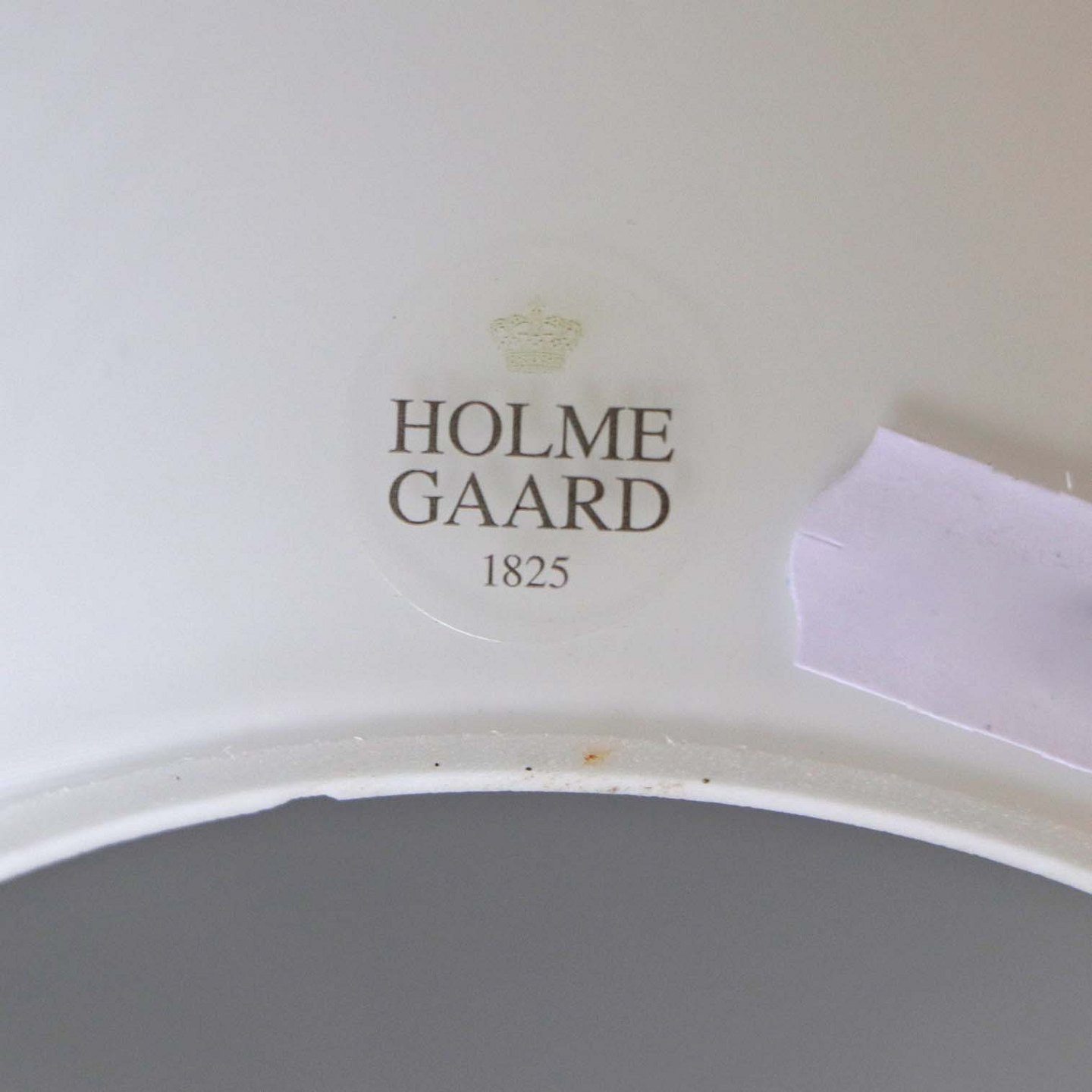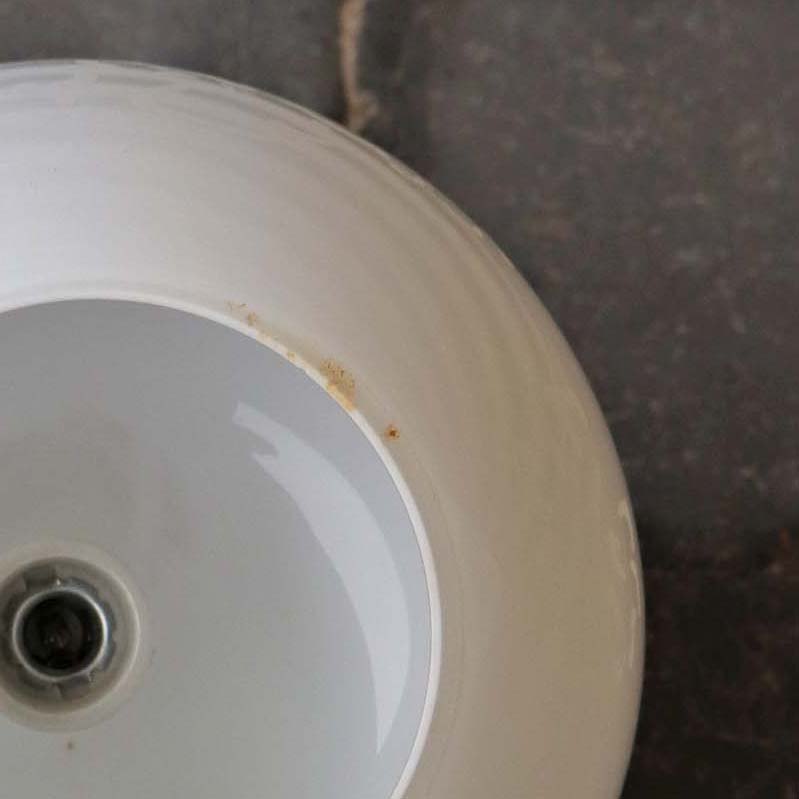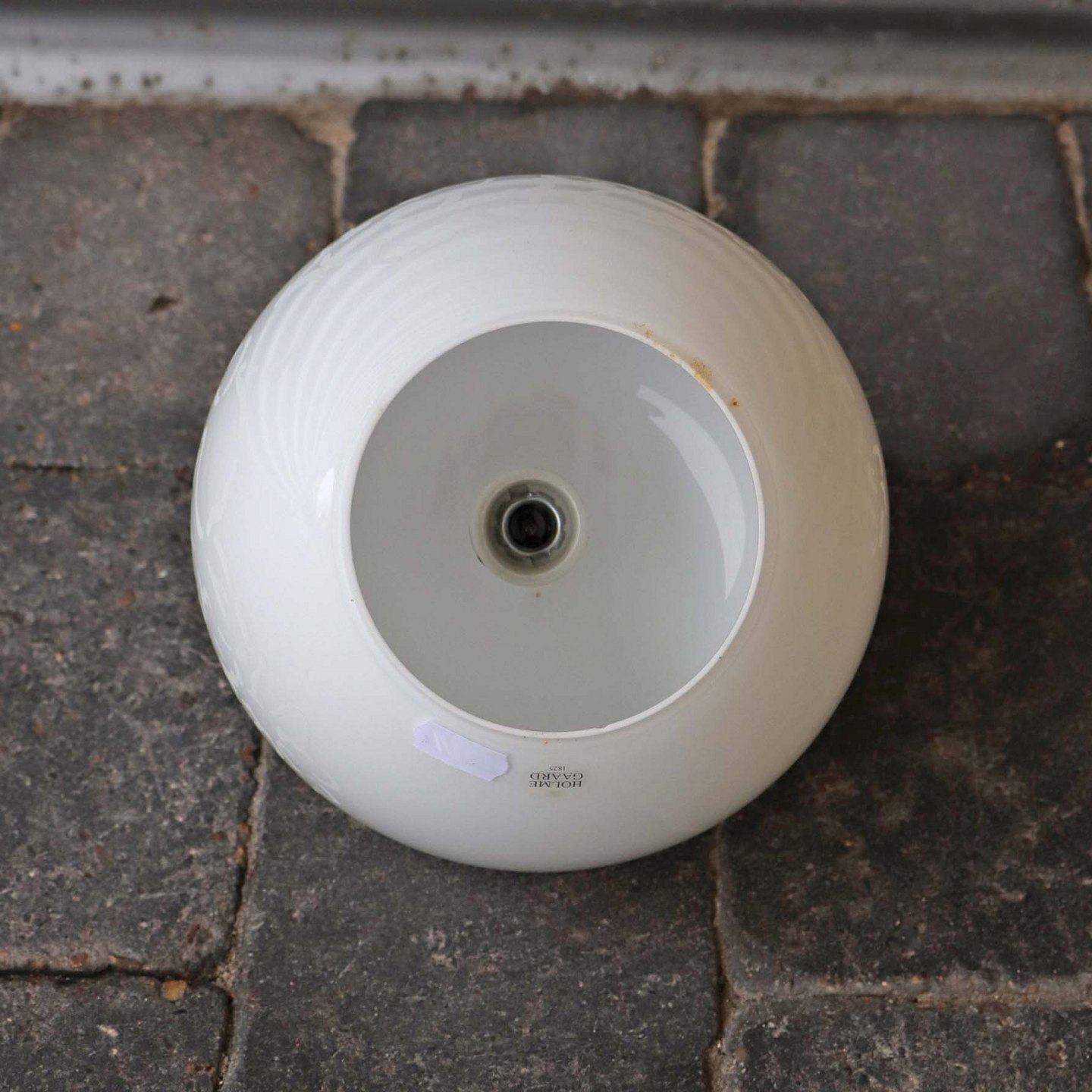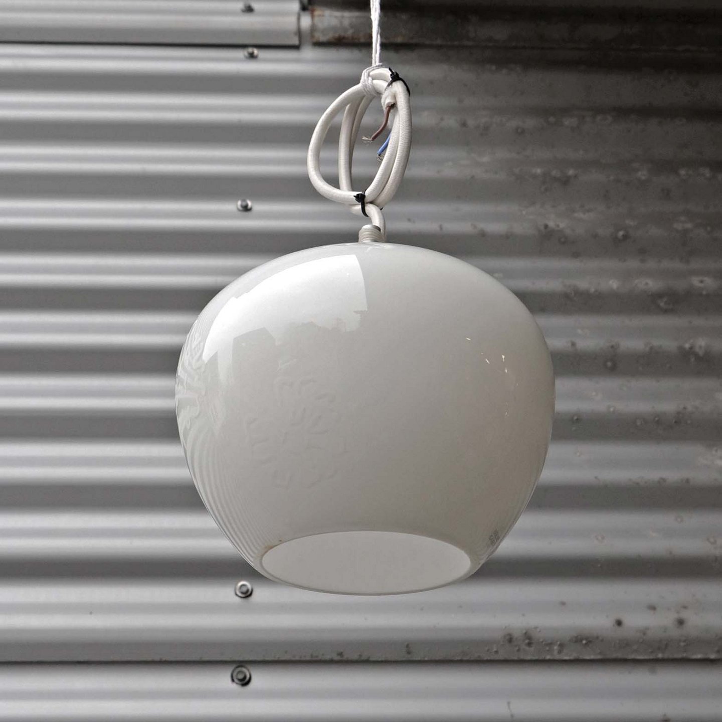 Pendel i hvidt mundblæst glas med blomstermotiver og porcelænsfatning