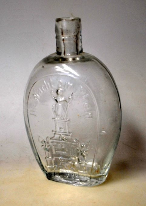 Tysk lommelærke i klart glas, 19. årh. Med motiv og teksten: Die Wacht am Rhein. H.: 12,5 cm. 1/8 L.