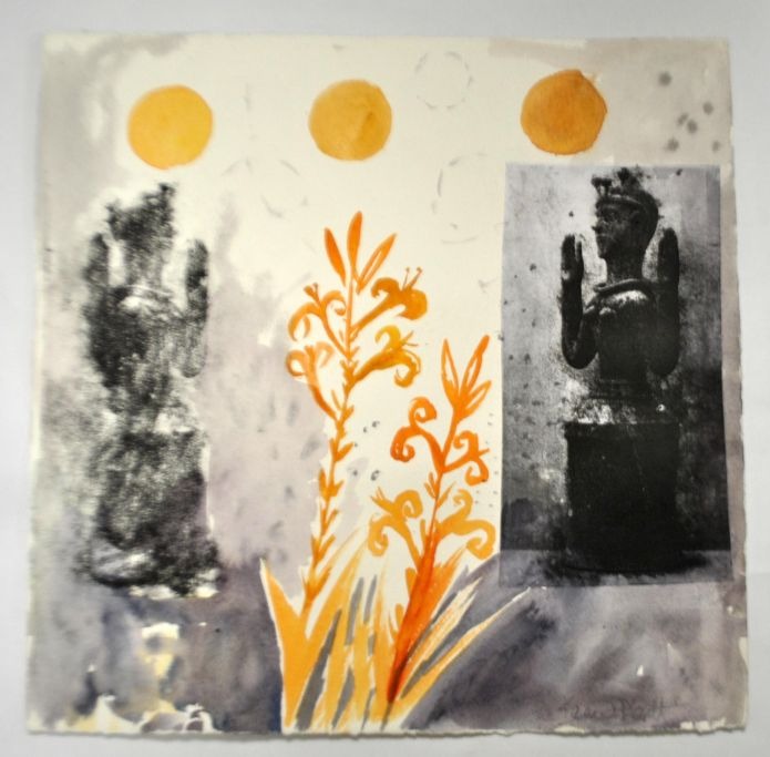 Degett, Karen (1954 - 2011) Danmark: Gule liljer. Akvarel og tryk på papir. Signeret: Karen Degett. Bagpå: "Gule liljer fra mor". 39,5 x 40 cm.
