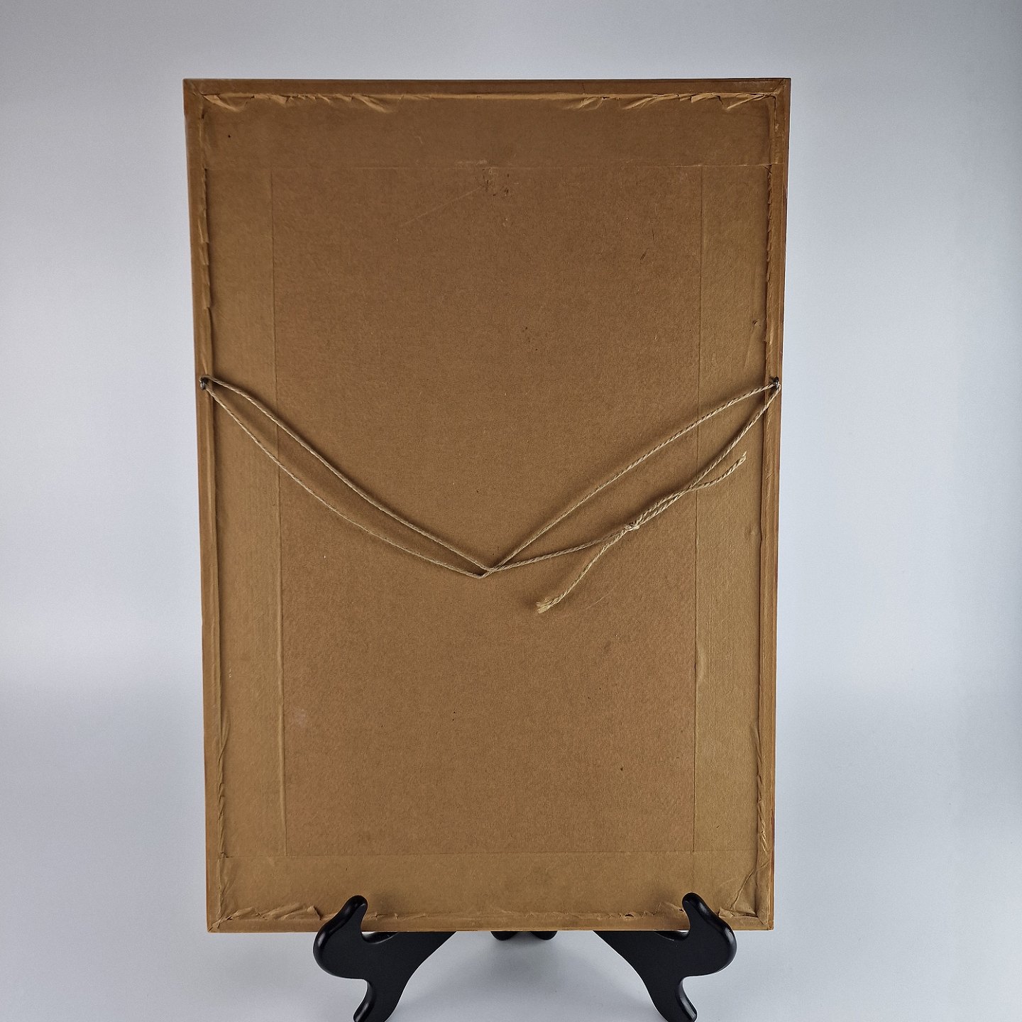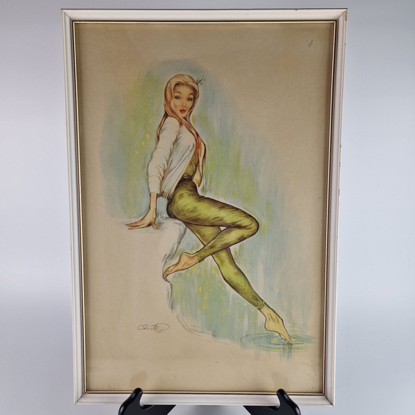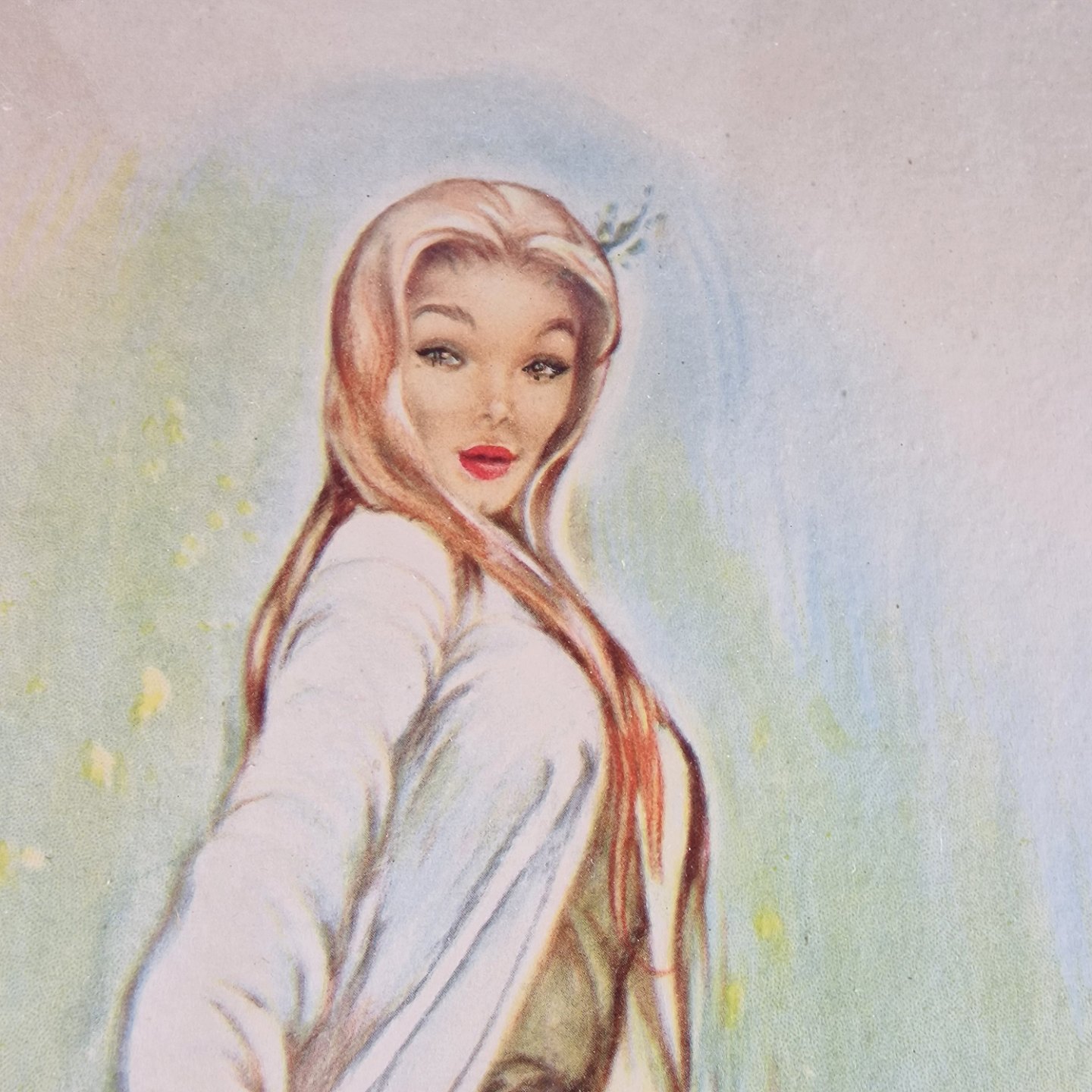 Grafisk tryk af blond kvinde i grønne bukser og hvid jakke. Fra 1940'erne