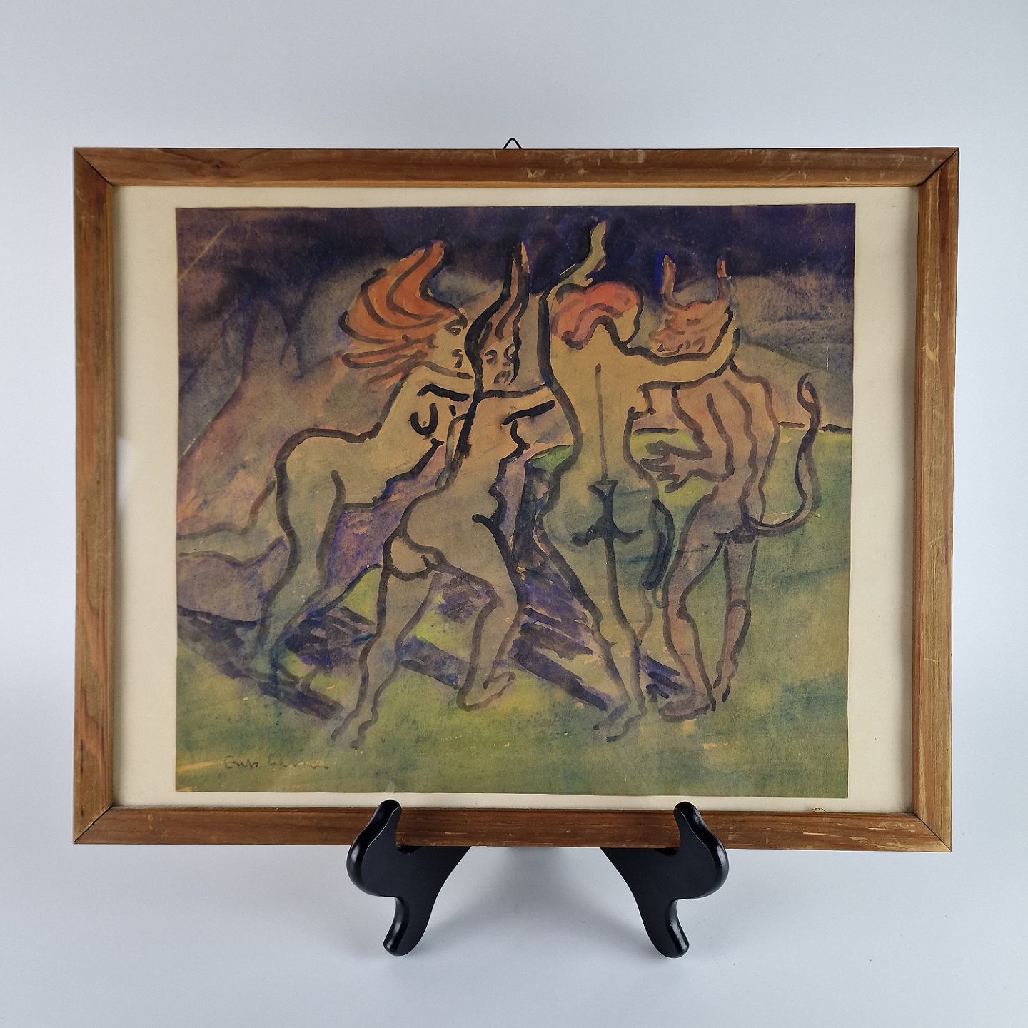 Akvarel med motiv af nøgne kvinder og en djævle omkring et bål