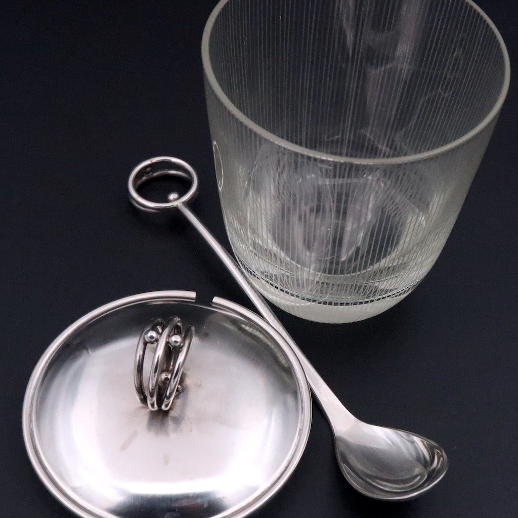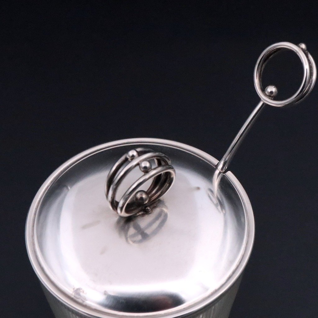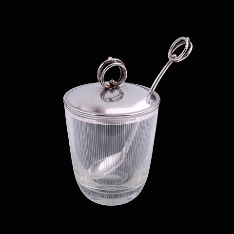 Carl Johan Antonsen. Art deco krukke i glas med låg og ske i sølv.