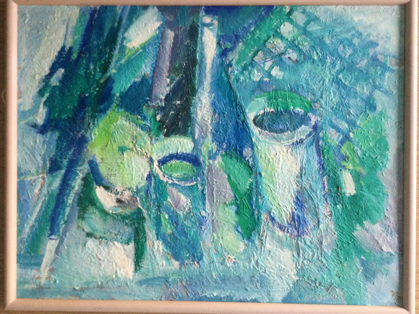 Maleri - Bendt Schneevoigt - Opstilling med flasker og krukker 1983.