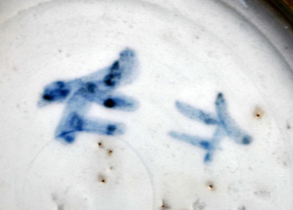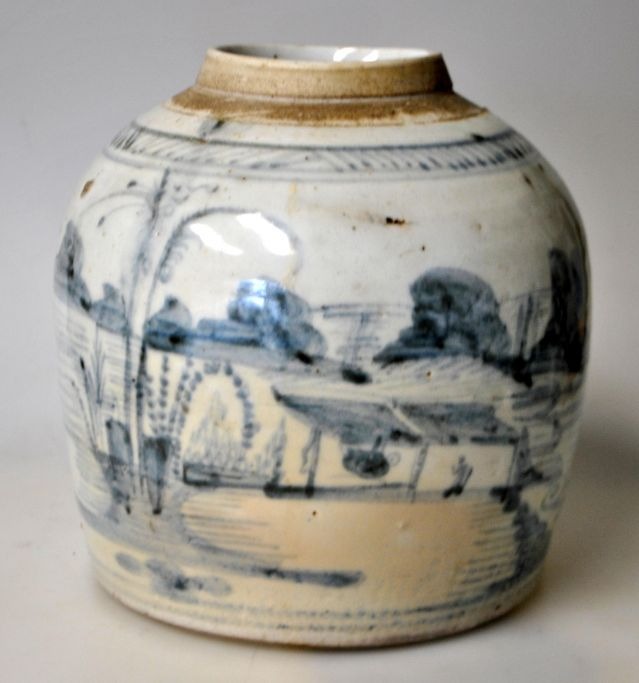Kinesisk bojan i porcelain. 19. årh. Kina. Glaseret. Med landskabsmotiv i blågrå bemaling. Signeret i bunden. H: 15 cm. Dia.: 16 cm.