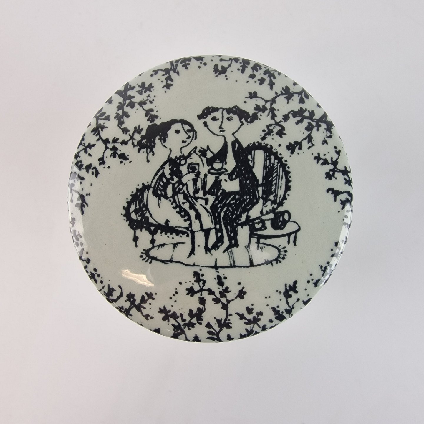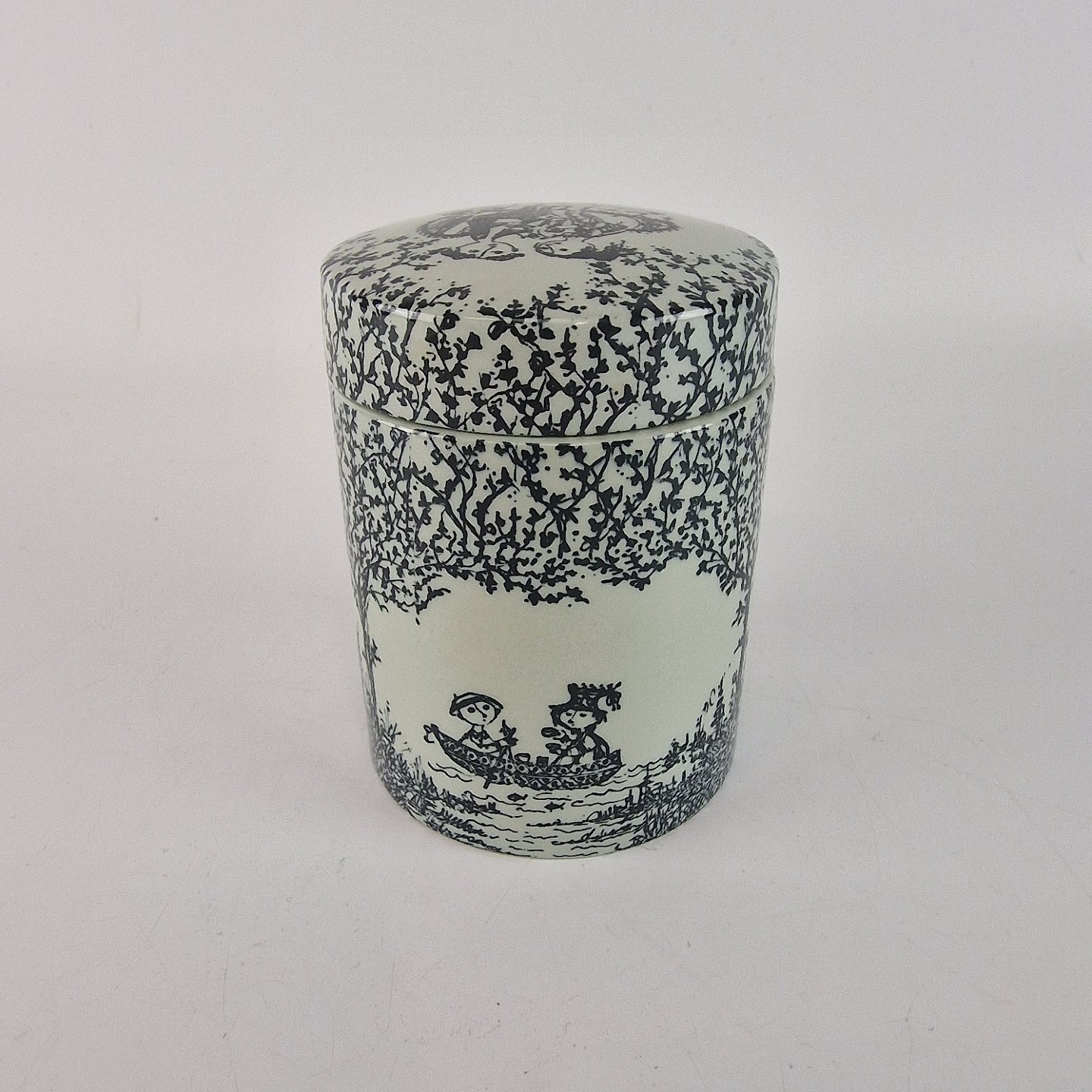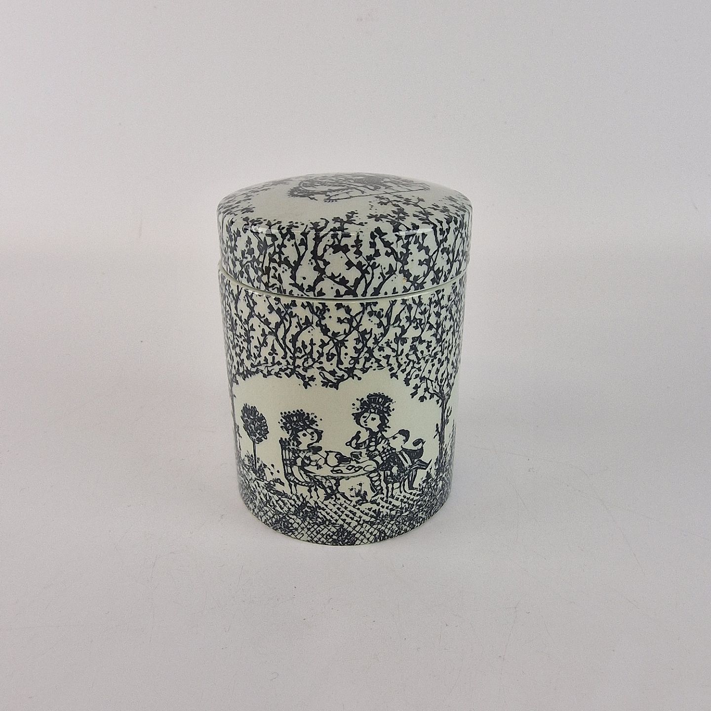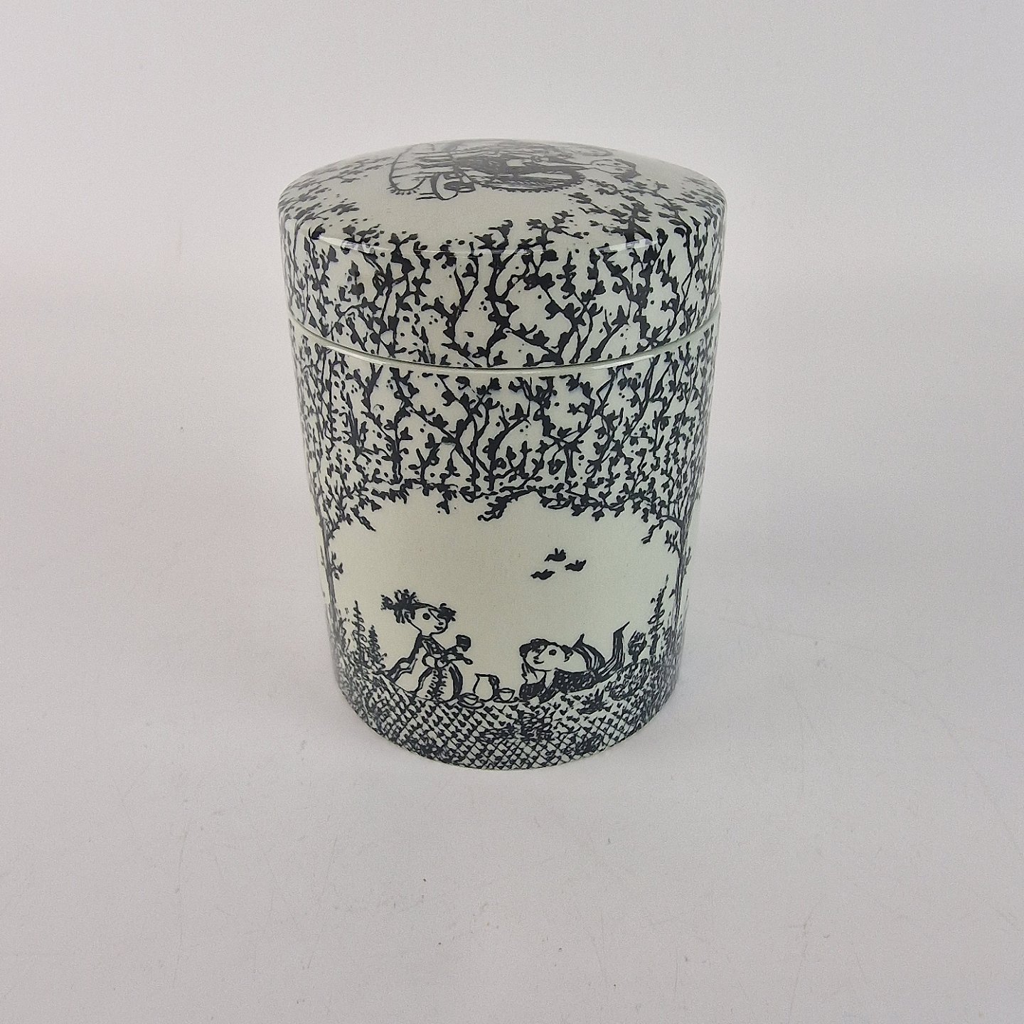 Krukke med låg dekoreret med det klassiske sort/hvide mønster. Flere forskellige motiver. Nr. 5943-681, arkivfoto