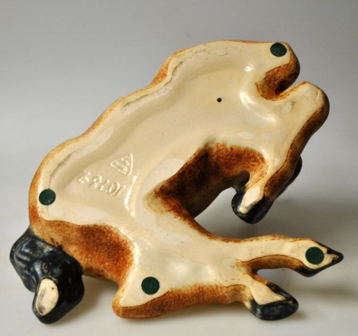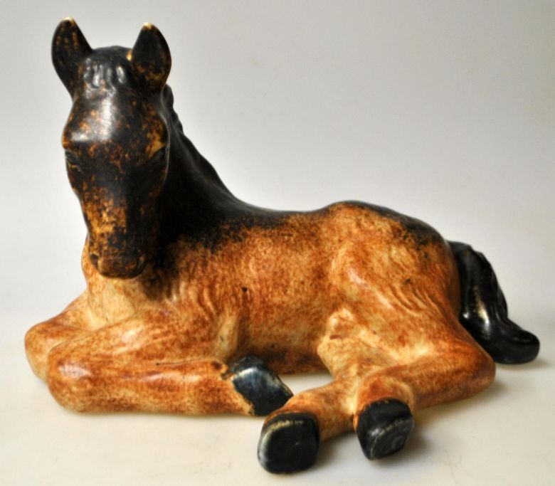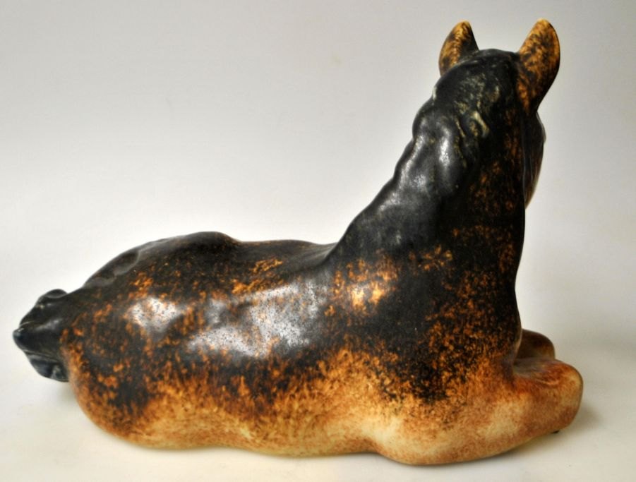 Michael Andersen & Søn: Liggende føl. no. 1078-2, 20. årh. Bornholm, Danmark. Bemalet ler. Stemplet. L.: 25 cm. H.: 16 cm.