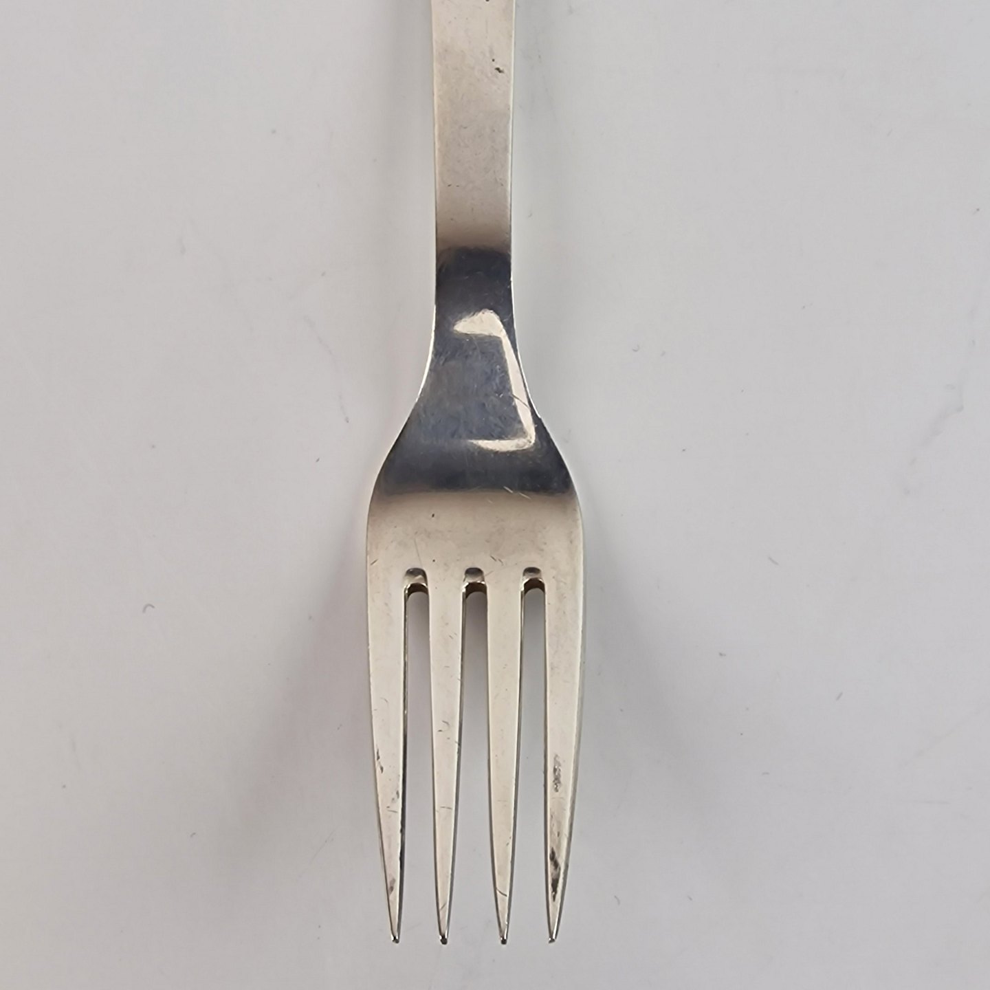Børnegaffel i tretårnet sølv med motiv fra H. C. Andersen eventyret Hyrdinden og skorstensfejeren