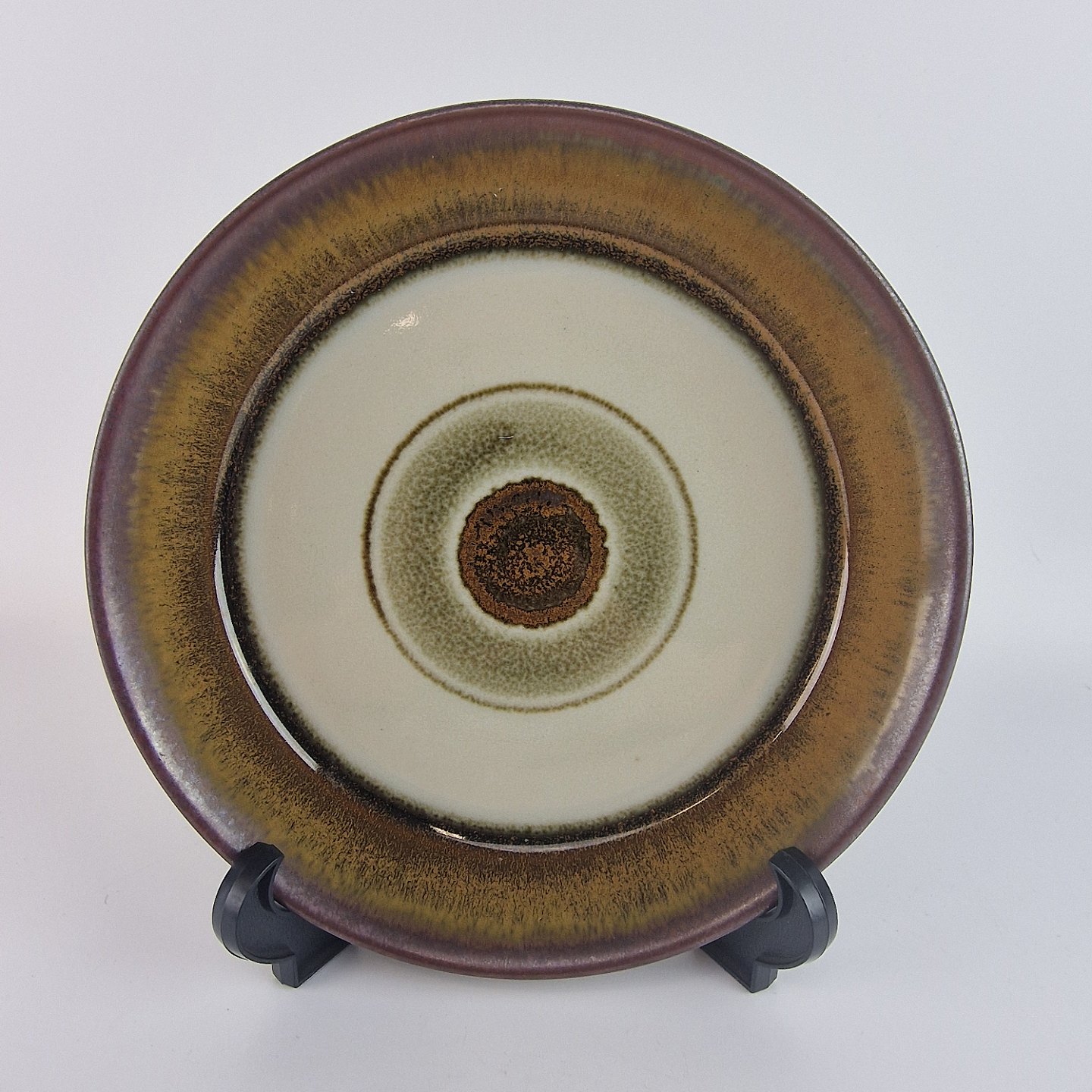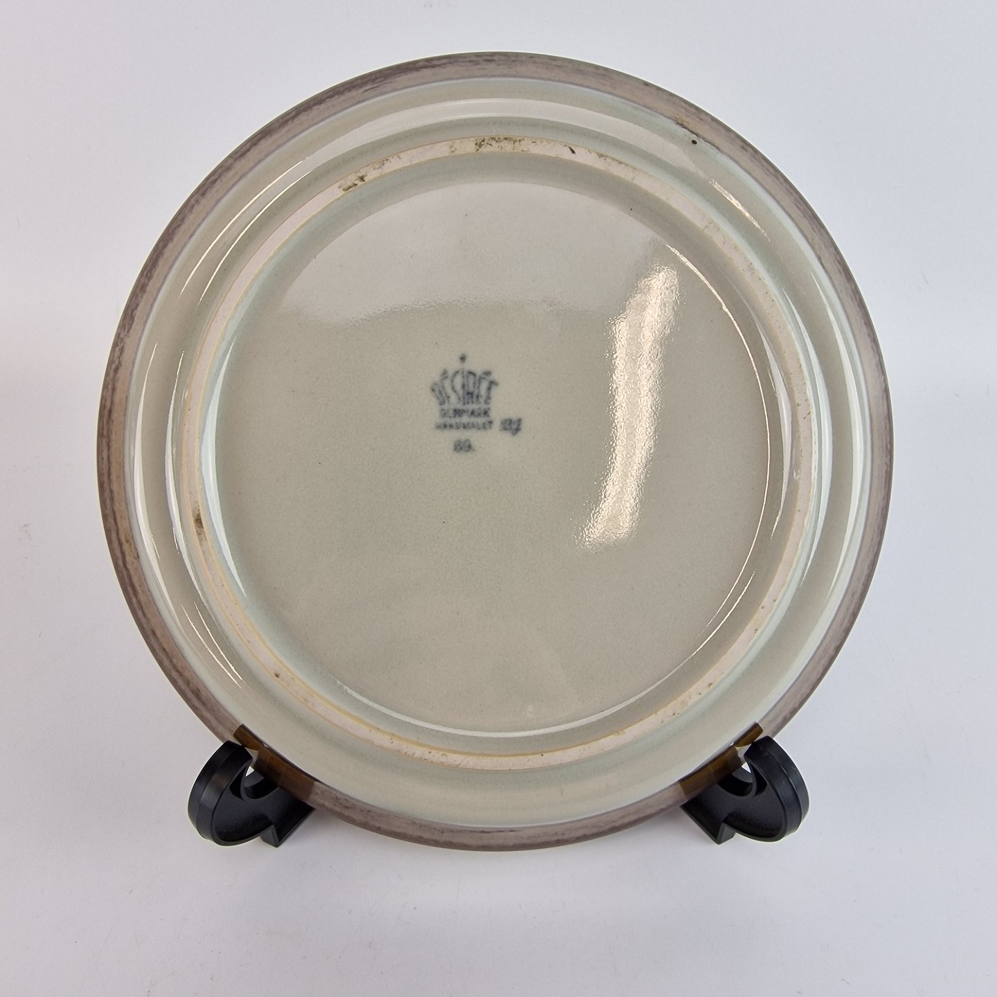 Diskos er af ovnfast stentøj. Stellet er gråt og håndmalet med brune og grønlige detaljer