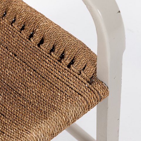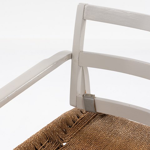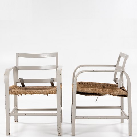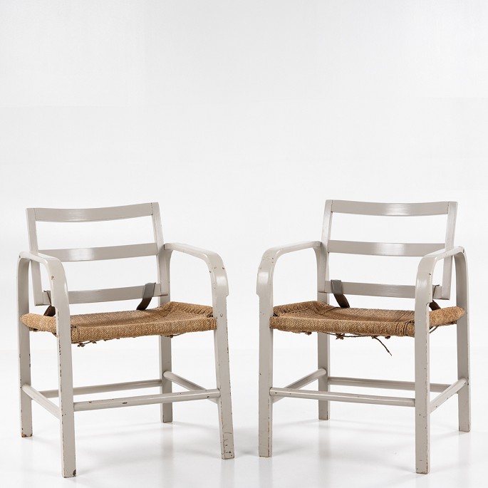 Par lænestole i gråmalet træ med patineret sæde af papirgarn og ryg med vippefunktion. Ca. 1933.