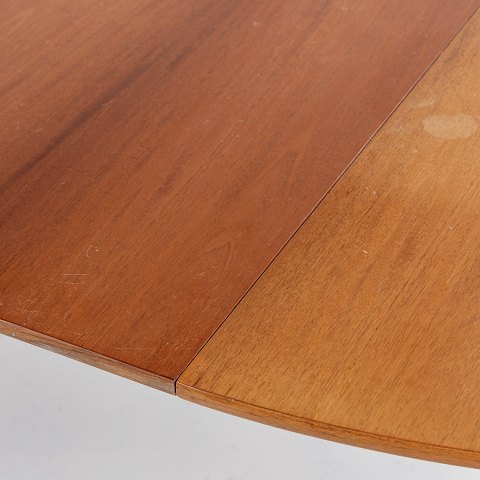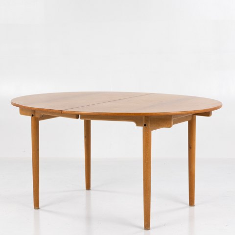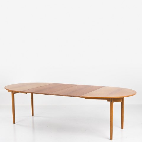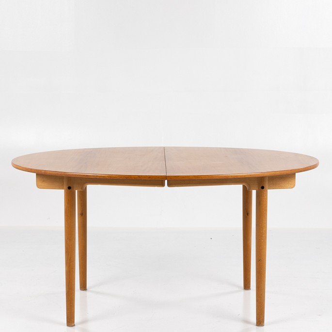 AT 332 - Ovalt spisebord i mahogni og stel af bøg med to tillægsplader. Tillægsplader måler i alt 110 cm extra.