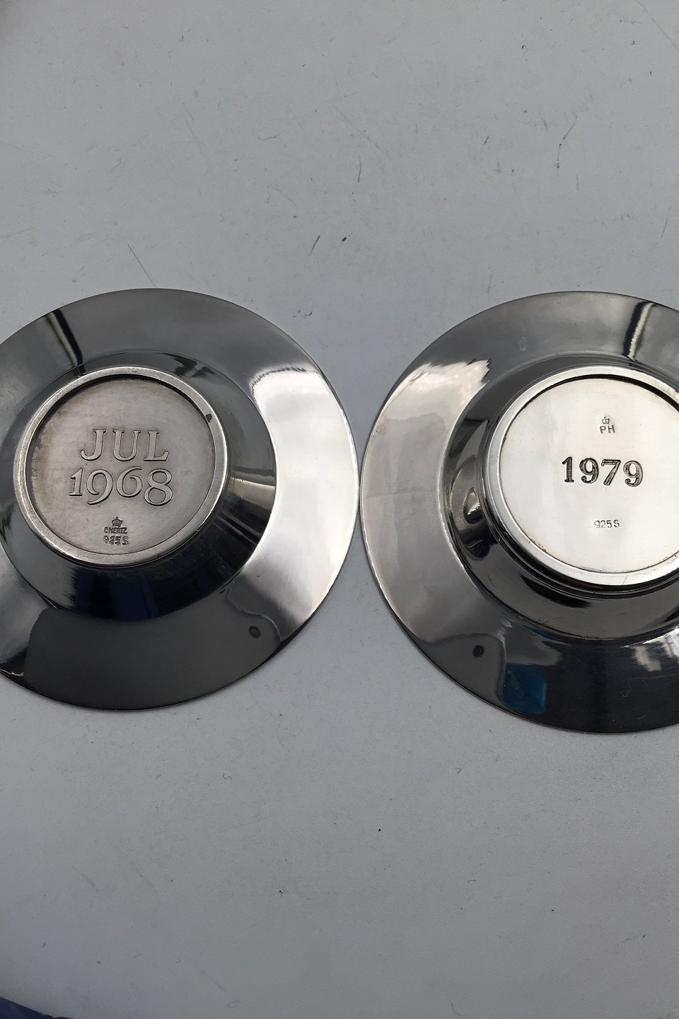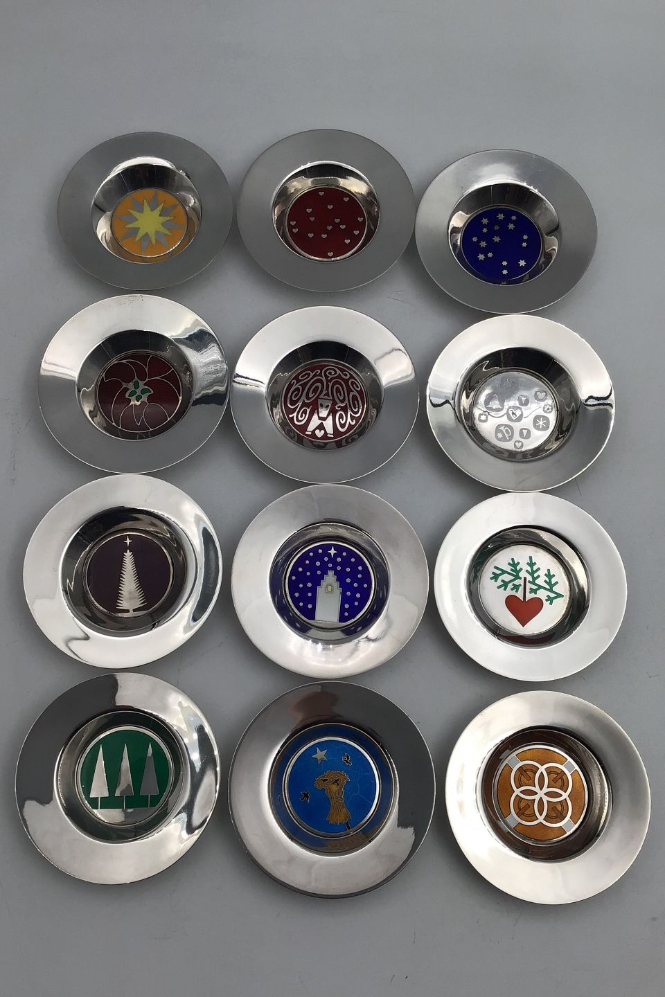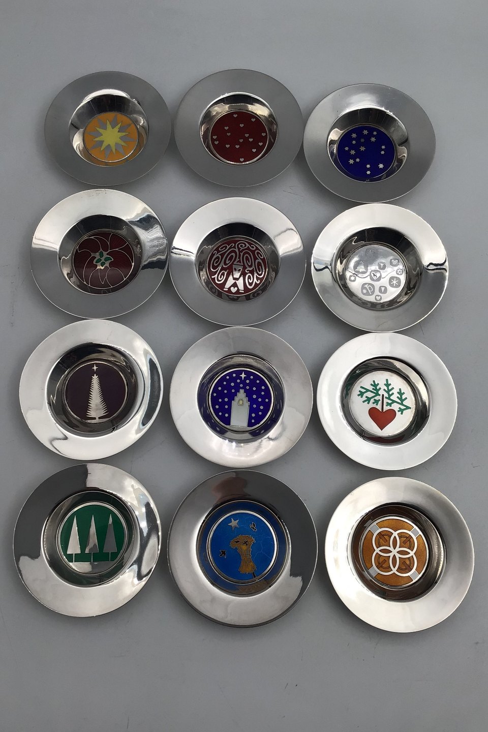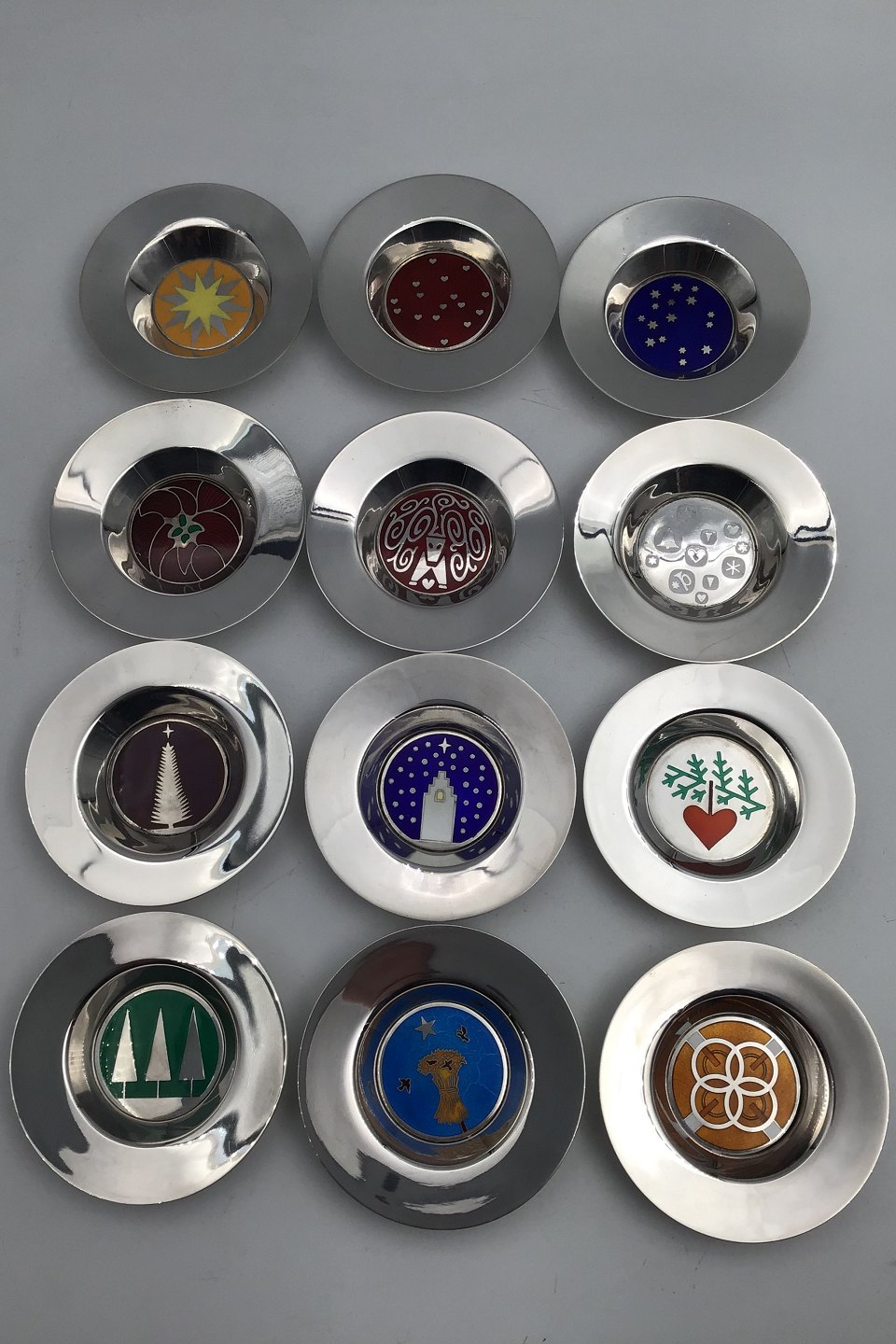 Peter Hertz Sterling Silver / Enamel Dish Set (12) (1968-1979) Measures Diam 7.5 cm (2.95 inch) H 1 cm (0.39 inch) Combined Weight 584 gr. (20.60 oz) (Various Christmas motifs)