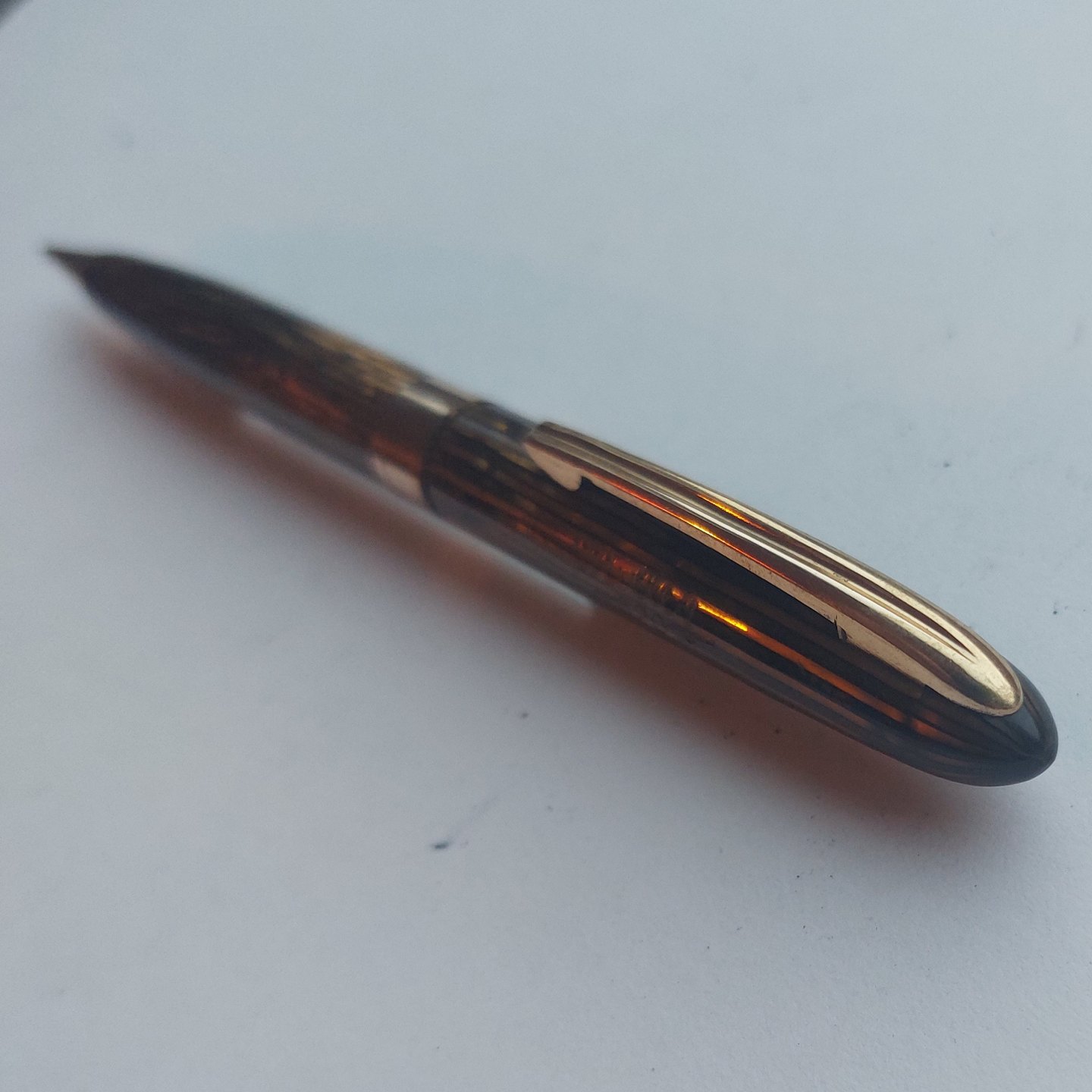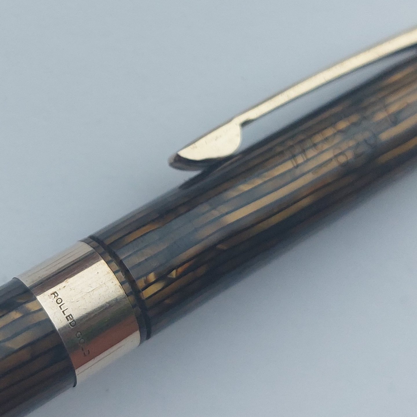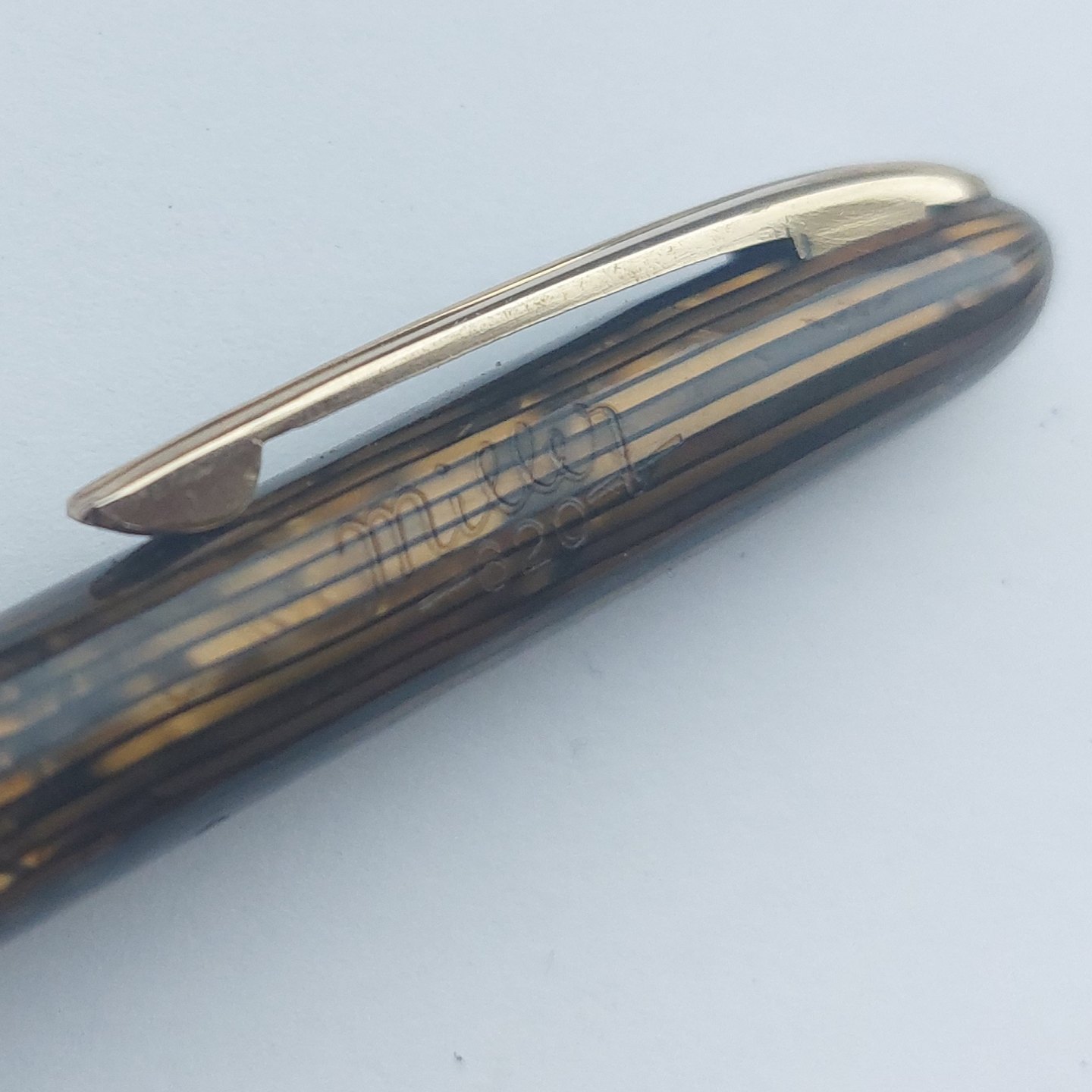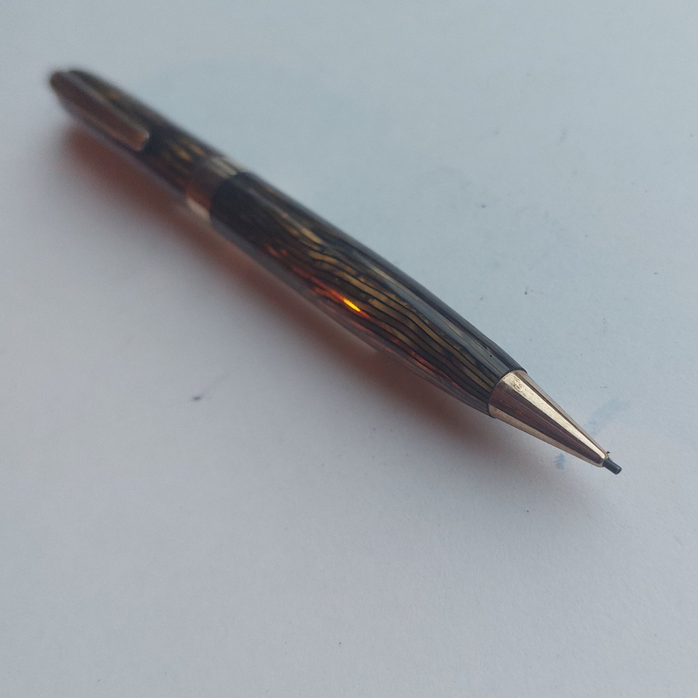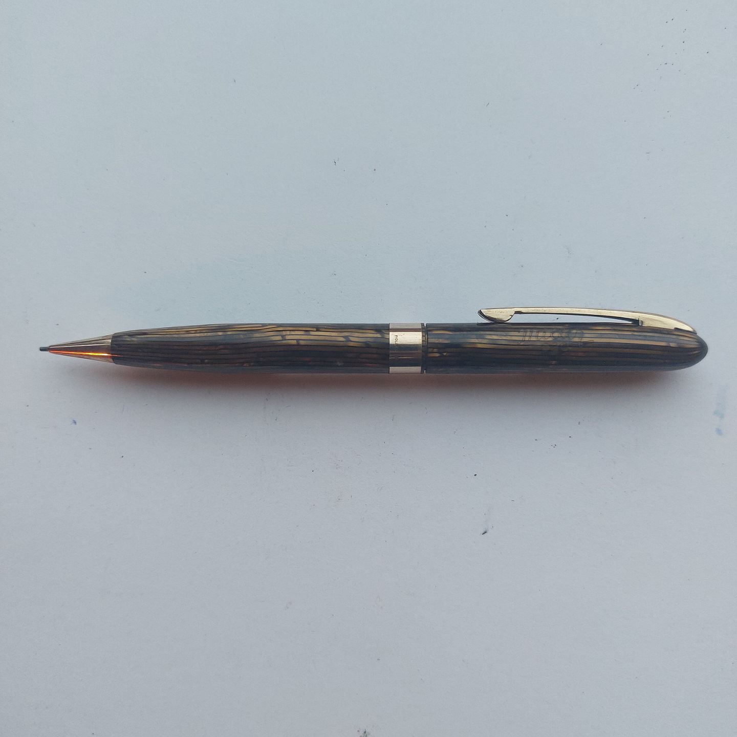 Slank grøn stribet Miller nr..620 skrueblyant. Bredt guld-double bælte på midten. Fremstår I god stand uden skader eller reparationer. Klar til at blive brugt. 12,8 cm.